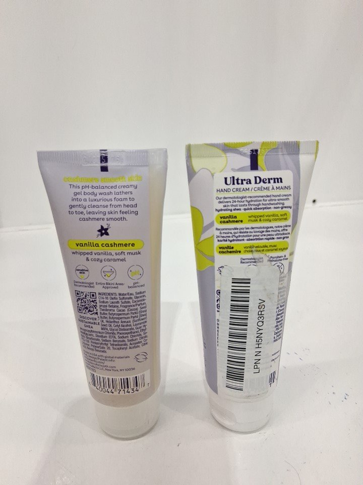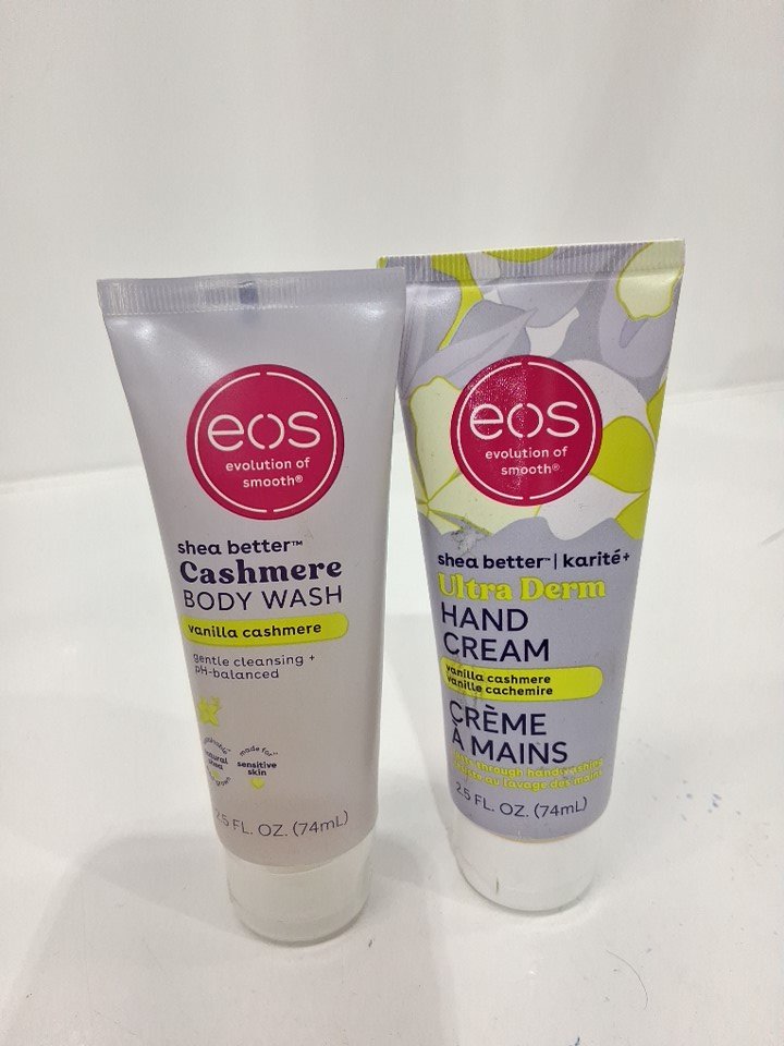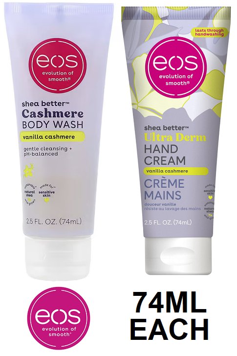 2 eos body care products - shea better cashmere body wash and shea better ultra derm hand cream - 74ml each - vanilla cashmere