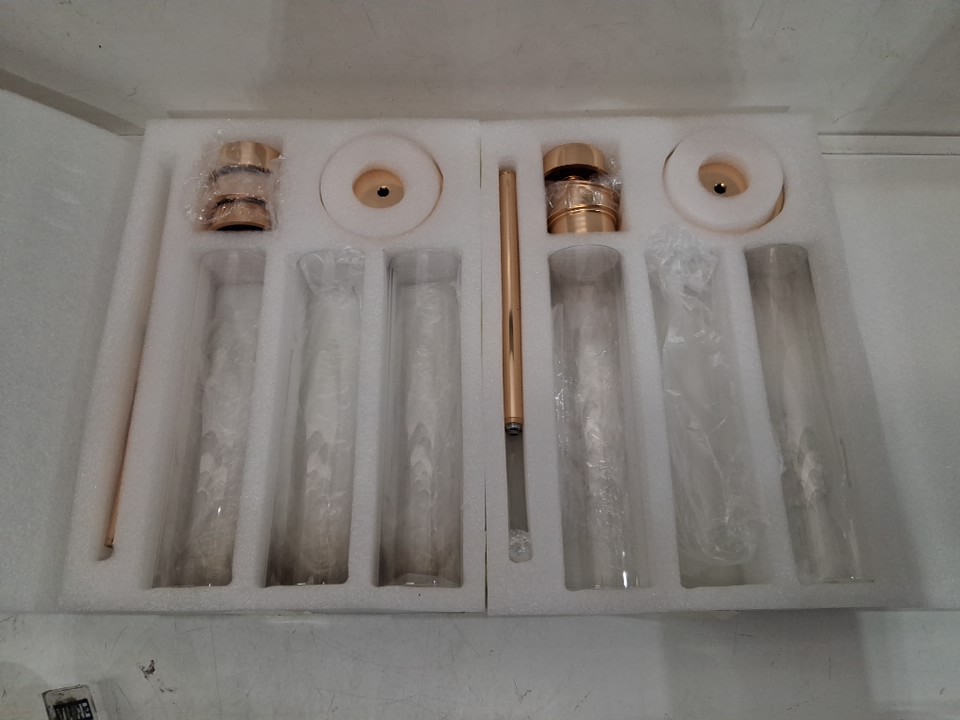 6pk hewory Hurricane Candlestick Holders - 19" / 16.5" / 14" - matte gold/clear