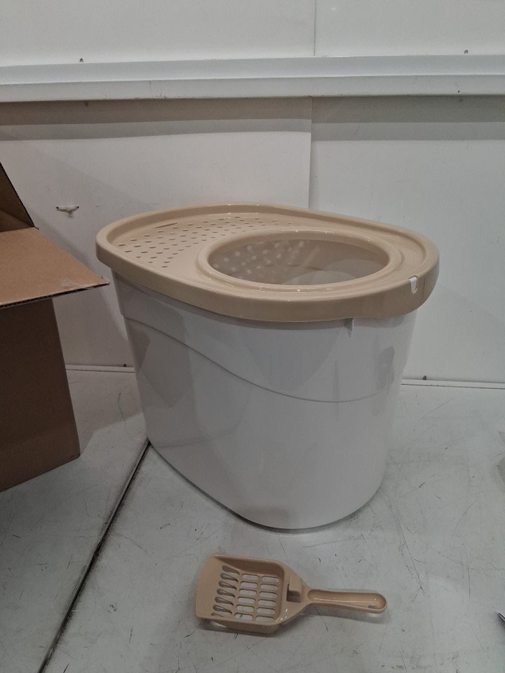 IRIS USA Large Stylish Round Top Entry Cat Litter Box with Scoop - 14.6"H x 20.5"w - white/beige (model: punt-530)