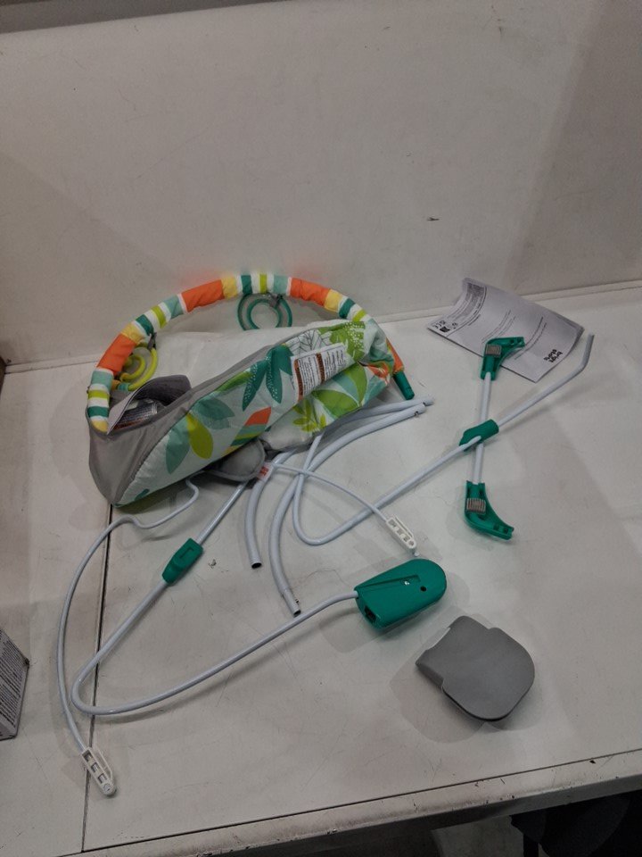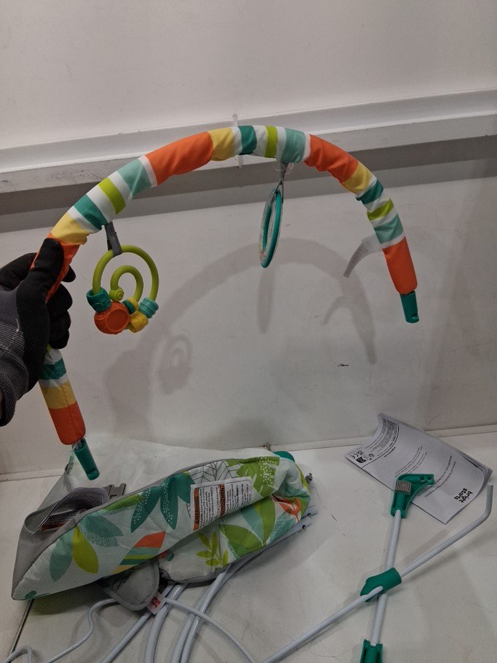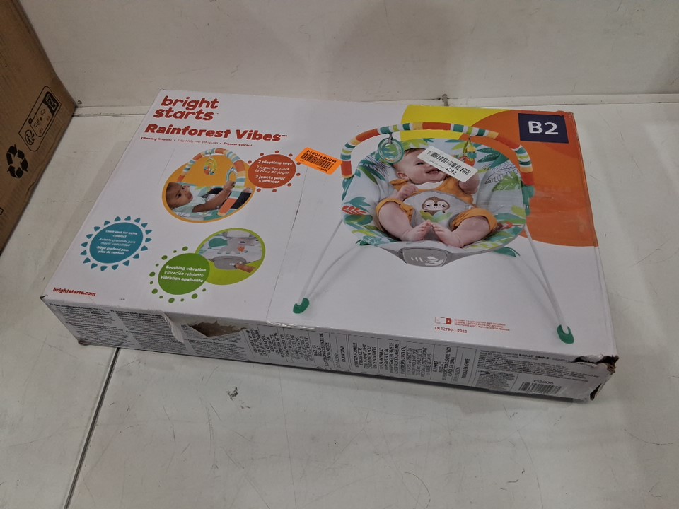 BRIGHT STARTS RAINFOREST VIBES PORTABLE 3-POINT HARNESS VIBRATING BOUNCER WITH TOY-BAR - RAINFOREST VIBES - (MODEL: 12227)