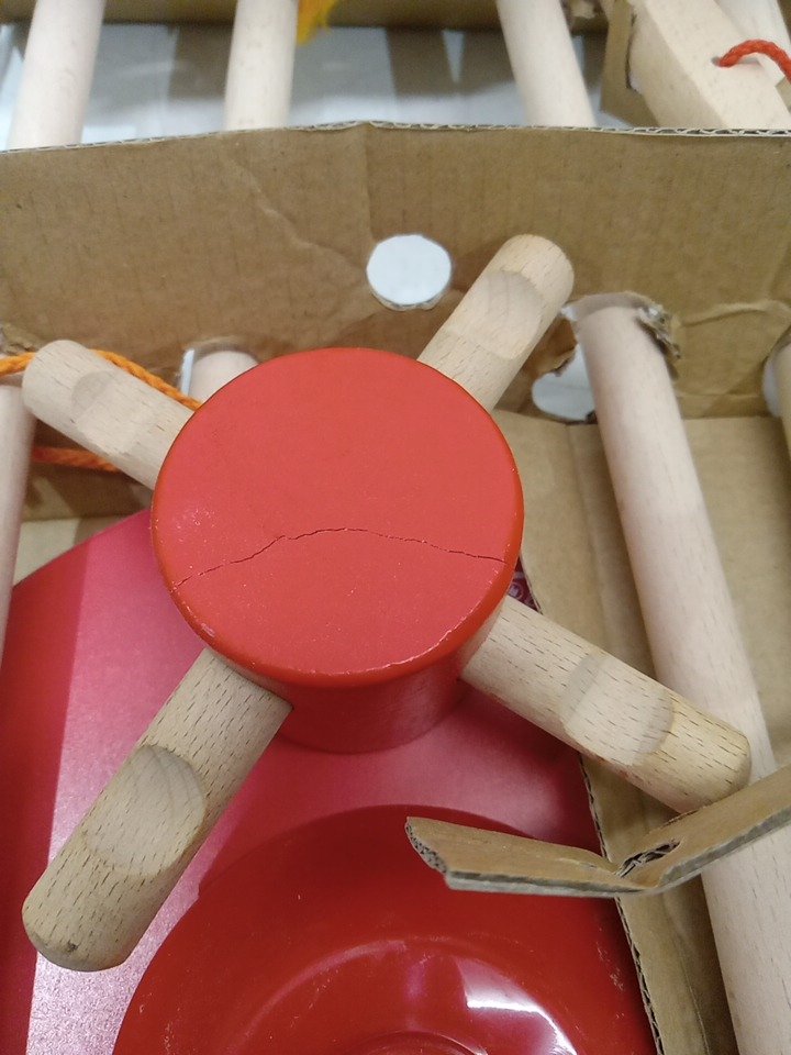 The top piece of the stand is cracked, could likely be filled with wood glue.