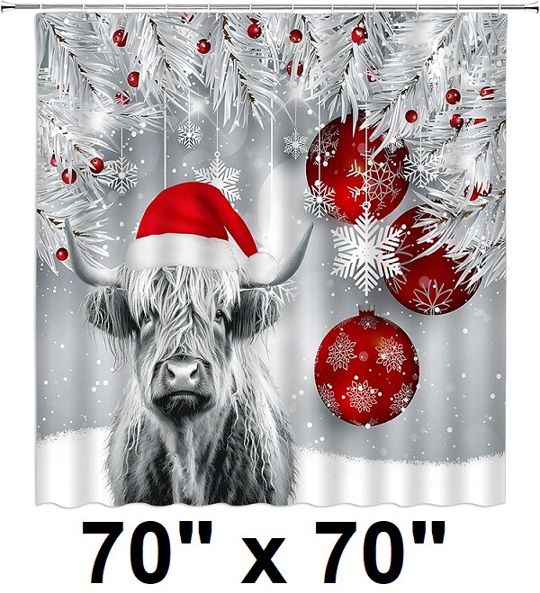 Christmas Shower Curtain Highland Cow - 70" X 70" - RED/WHITE/GREY