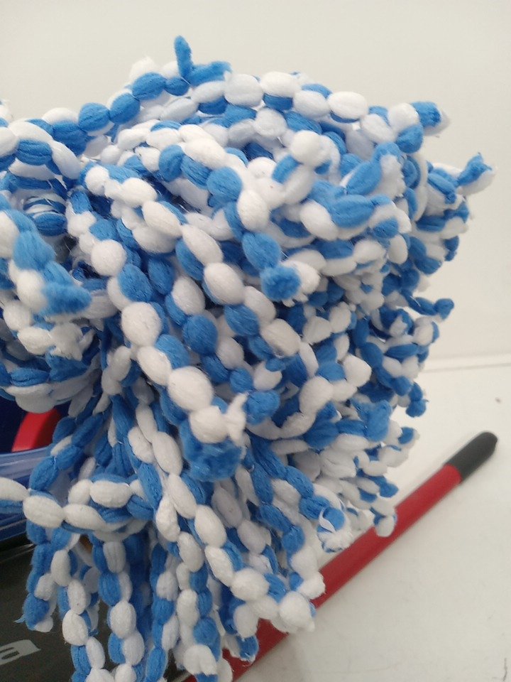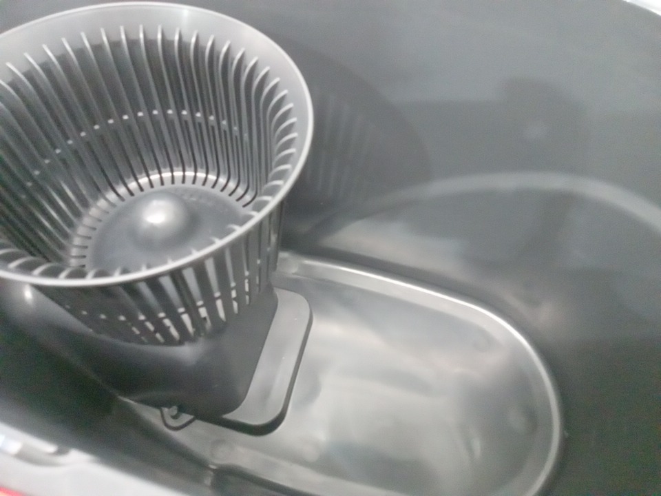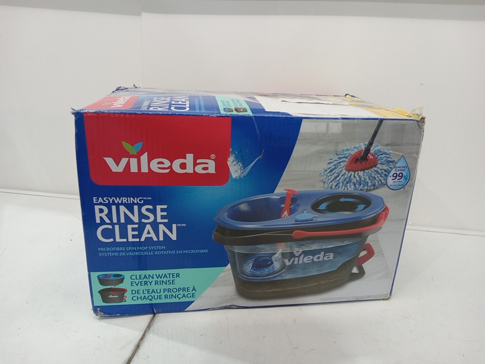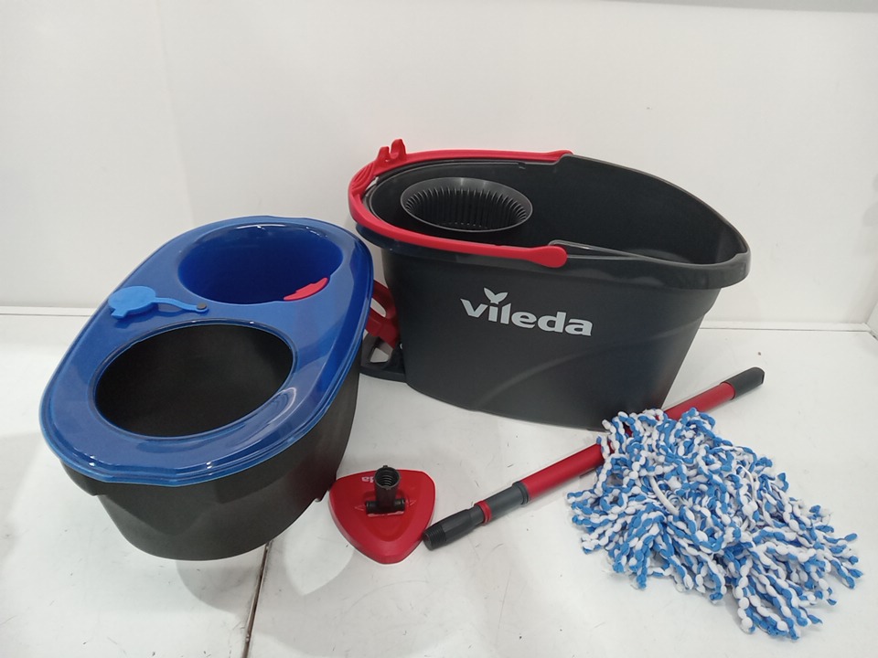 The mop is a little wet and the bucket has water stains