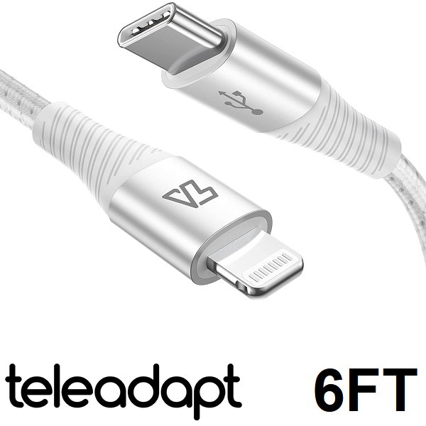 teleadapt extra long braided fast charge flexible charging cable - lightening to usb-c - 6ft - 3a - 480mbps - silver /white