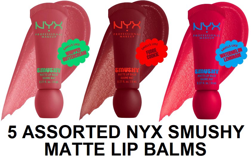5 assorted nyx smushy matte lip balms - assorted shades - smb07 swipe 2 smooth / smb10 sassy stuff / smb05 snuggle szn