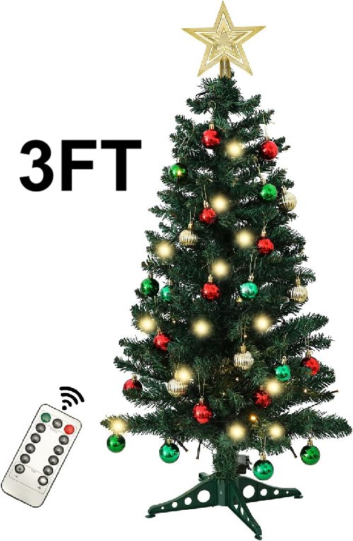 JoyofXmas Artificial Christmas Tree with 50 Warm Lights, Star and Decorations, and Remote Control - 3 FT - Green