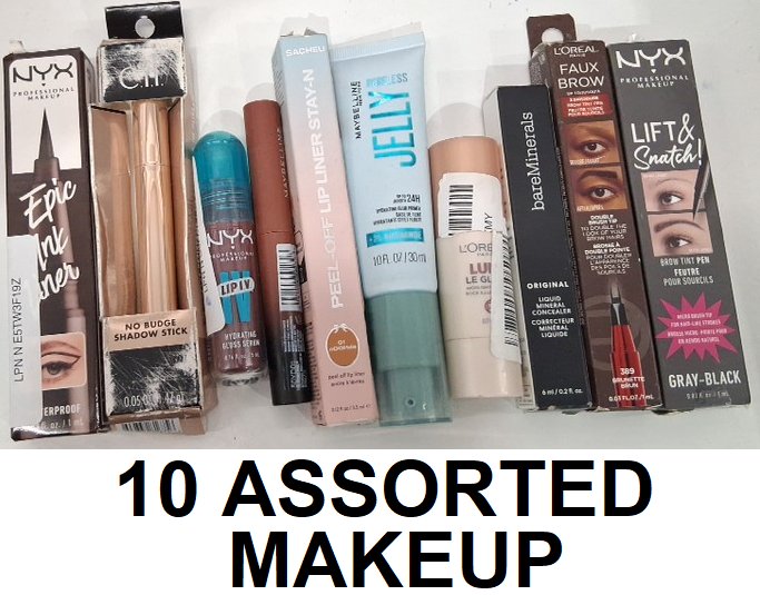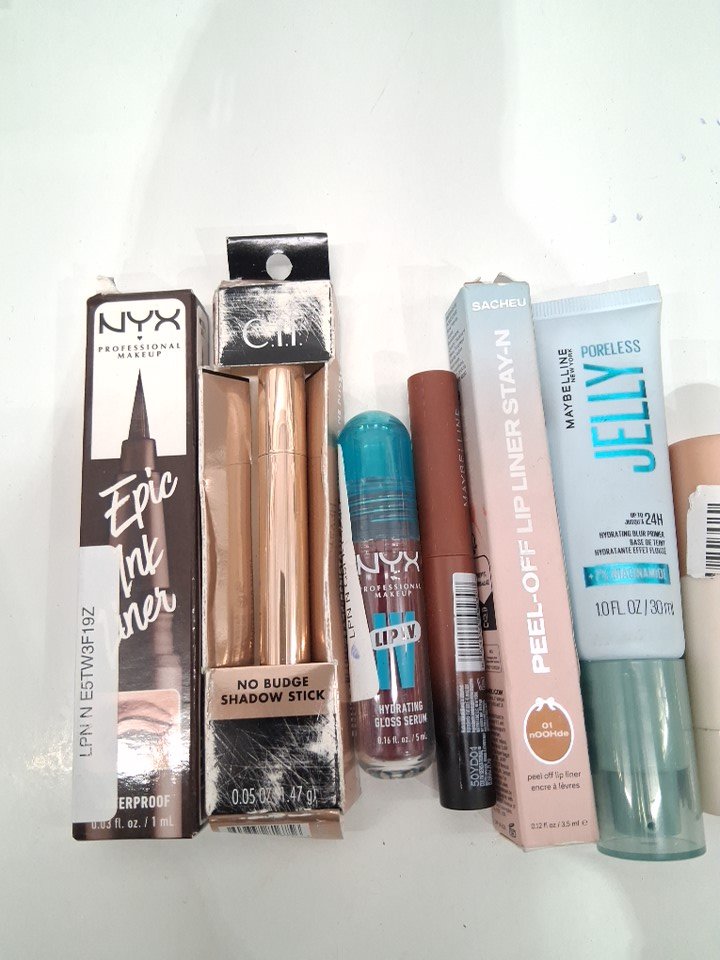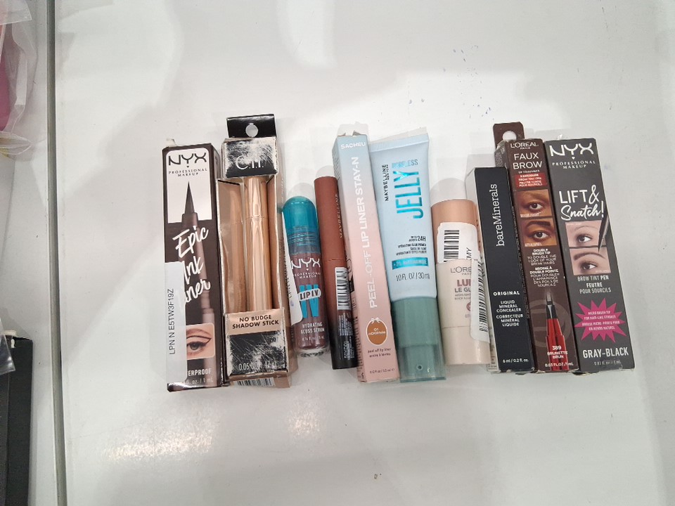 10 assorted makeup - assorted brands, shades and finishes - eyeliner / brow pencil / primer / highlight / lip gloss / eyeshadow stick