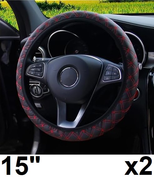 2 Anti-Slip Breathable PU Leather Elastic Steering Wheel Protector cover - 15" - black/ red stitching