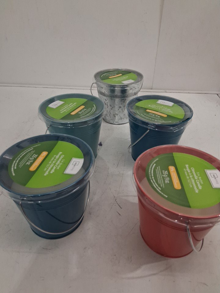 5 MAINSTAYS CITRONELLA CANDLE BUCKETS - 5" - 9 OZ - ASSORTED COLORS