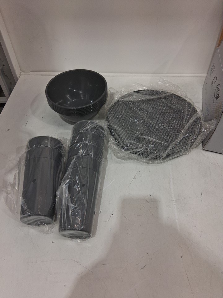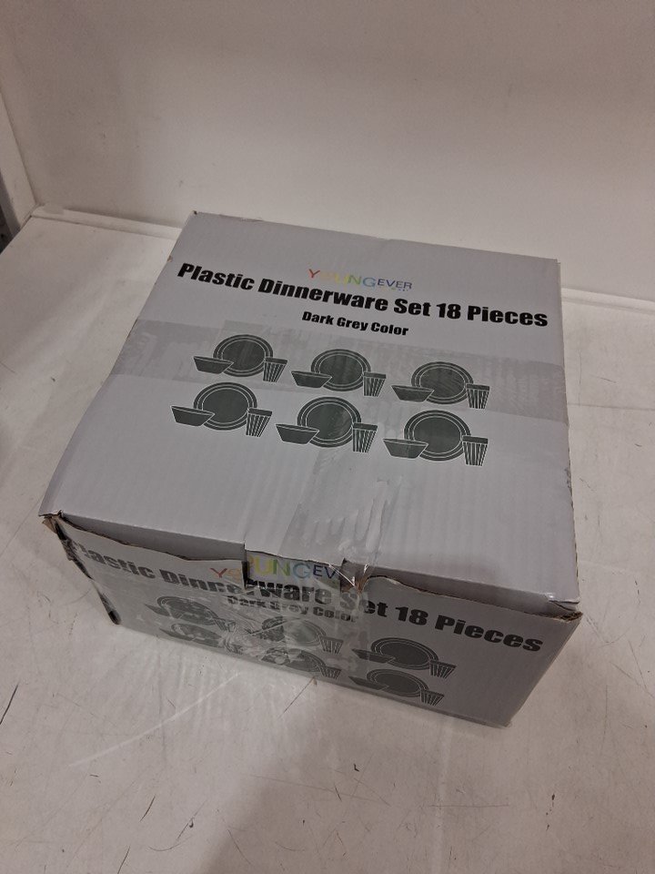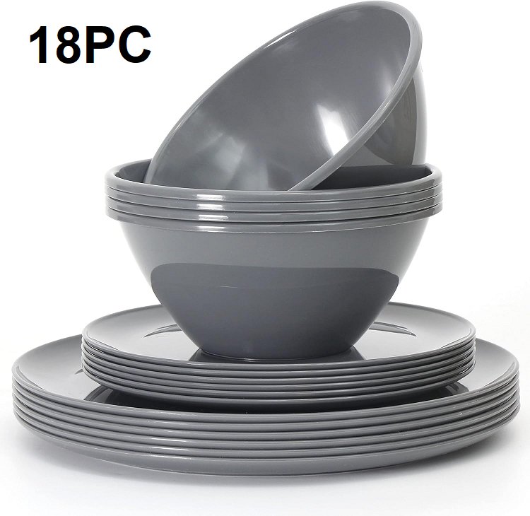 18PC Youngever Plastic Kitchen Dinnerware Set, Plates (8 Inch & 10 Inch), Bowls (32OZ),- DARK GREY