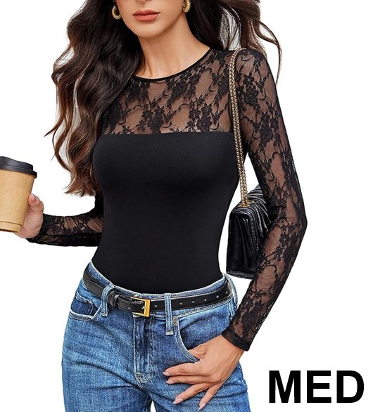 Women'S Avidlove Long Sleeve Lace Crew Neck Body Suit - MEDIUM - BLACK