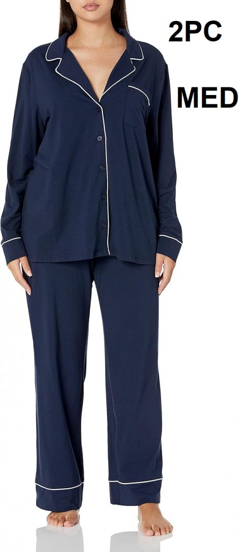 2PC AMAZON ESSENTIAL Womens Cotton Modal Long Sleeve Shirt Full Length Pant Pajama Set- MEDIUM - NAVY