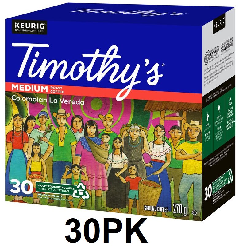30PK TIMOTHY'S COLOMBIAN LA VEREDA MEDIUM ROAST KEURIG K-CUP COFFEE PODS