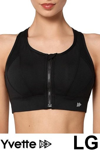 WOMEN'S YVETTE ZIP FRONT SPORTS BRA - HIGH IMPACT - Large - BLACK