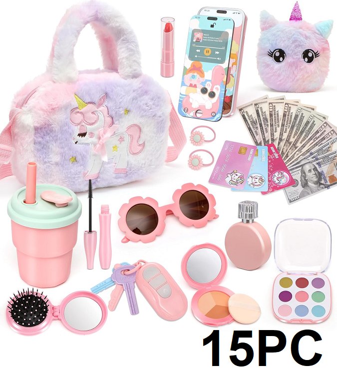 Girl's Chinloca Handbag with Pretend Makeup Set, Toy Phone, Wallet AND Water Bottle - pink