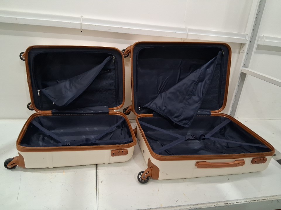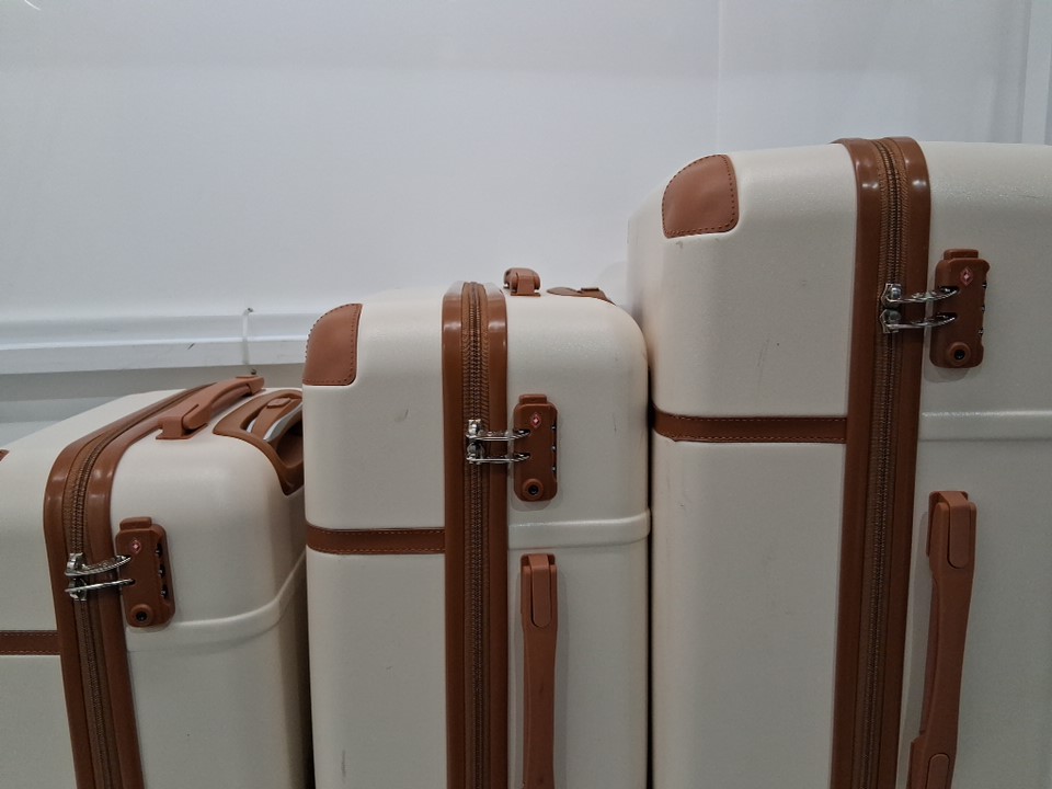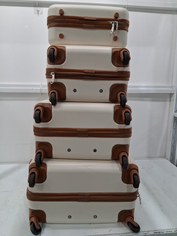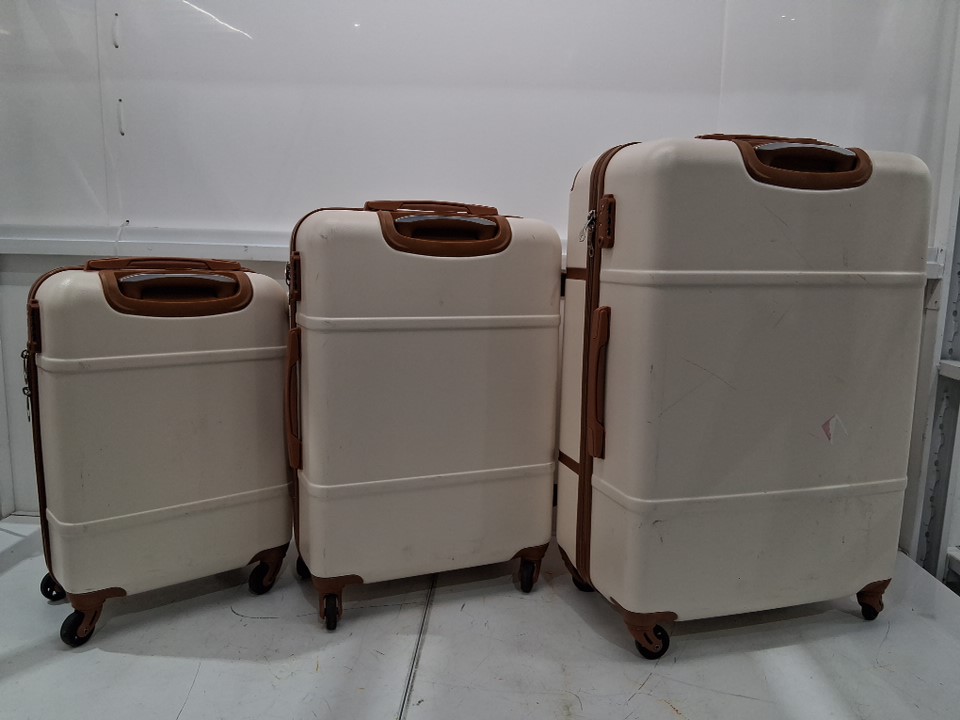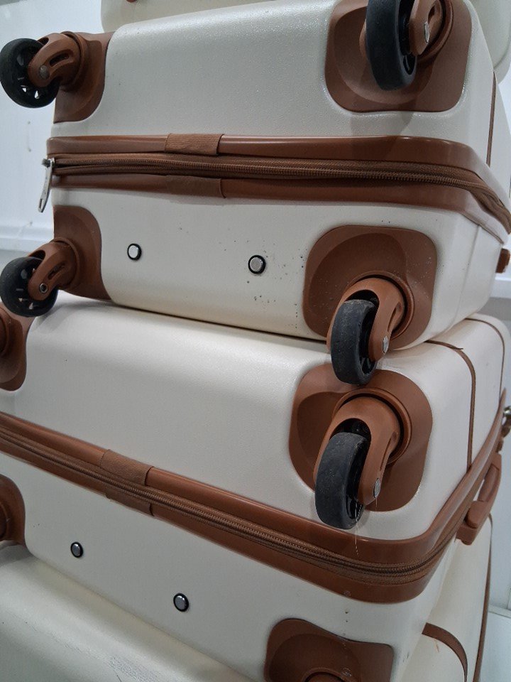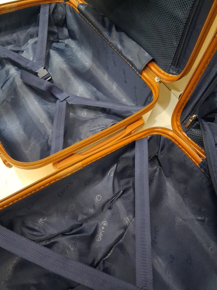 Some dirt/sand inside suitcases and marks/scuffs/scratches on outside due to previous use. This set is originally 6 pieces but ours is missing the small cosmetics bag.