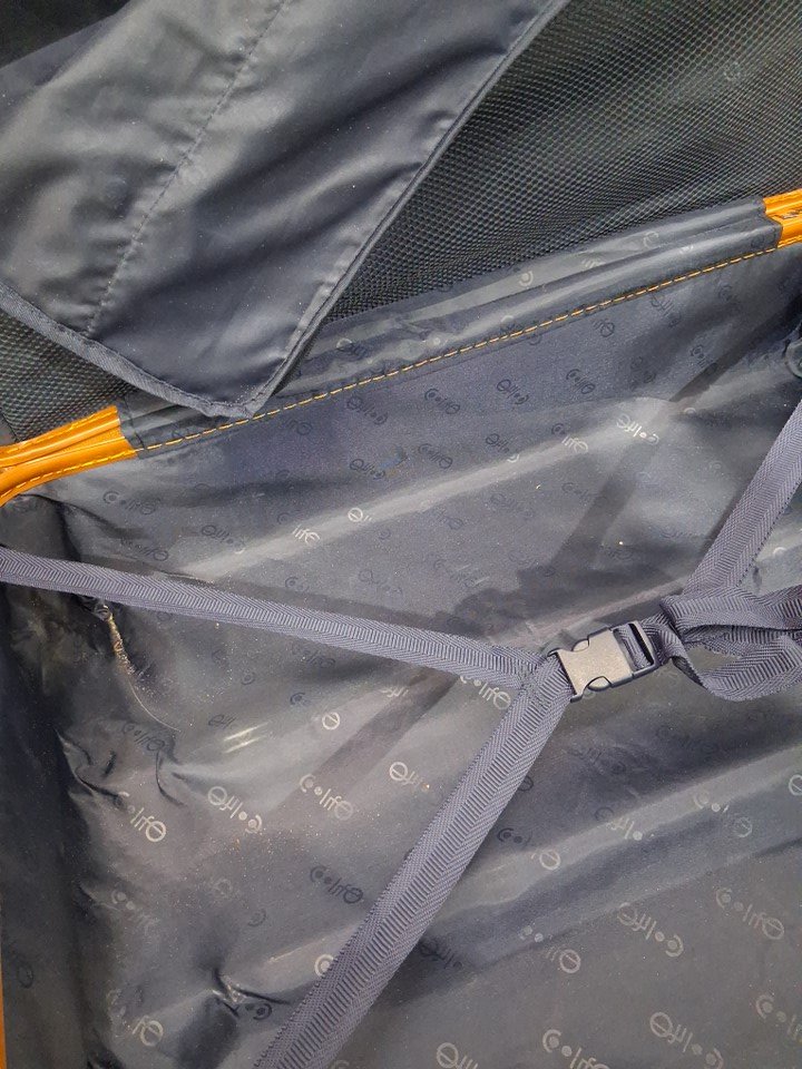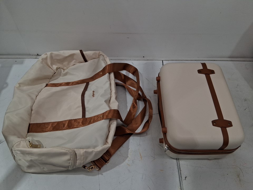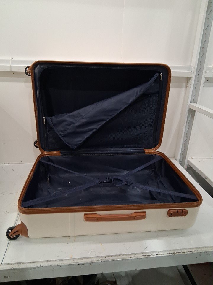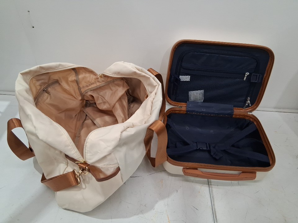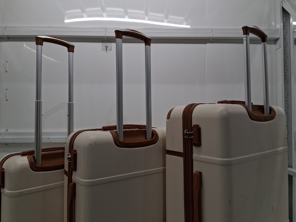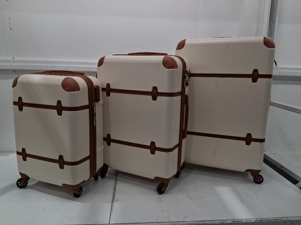 Some dirt/sand inside suitcases and marks/scuffs/scratches on outside due to previous use. This set is originally 6 pieces but ours is missing the small cosmetics bag.