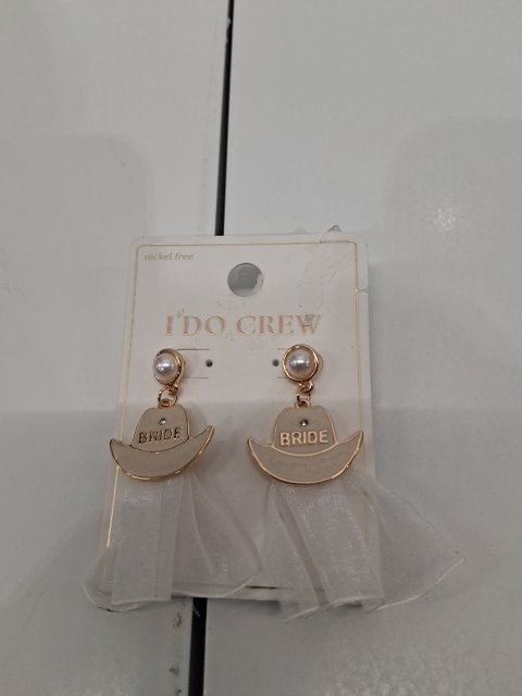 1PR womens i do crew cowboy hat bride earrings - nickel free - white / gold