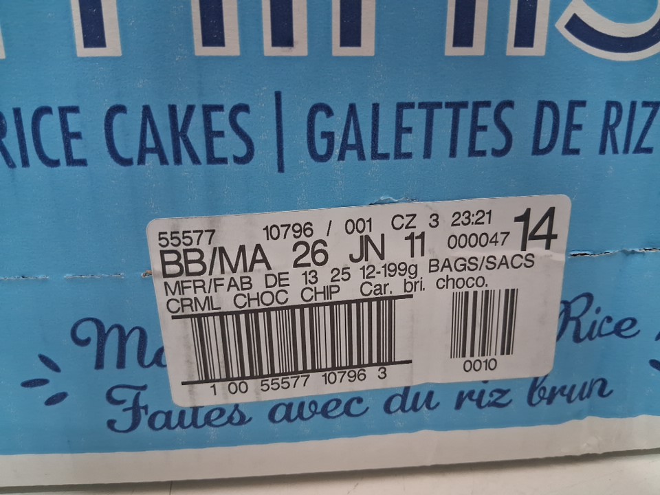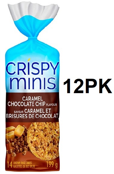 12PK QUAKER CRISPY MINIS GLUTEN FREE LARGE RICE CAKES- CARAMEL & CHOCOLATE CHIP -199G/EACH