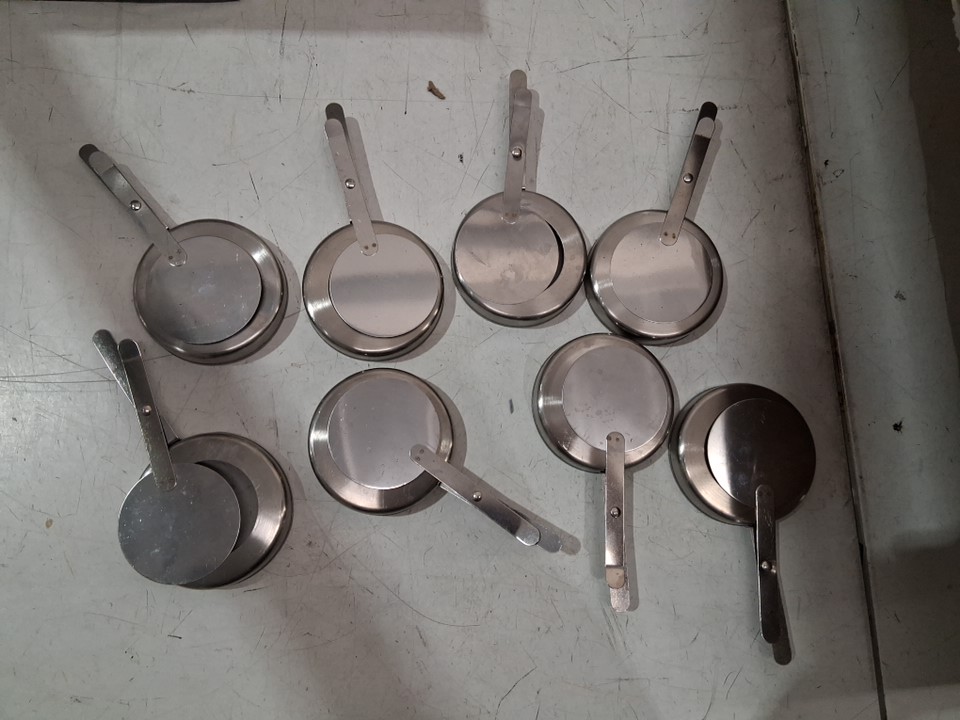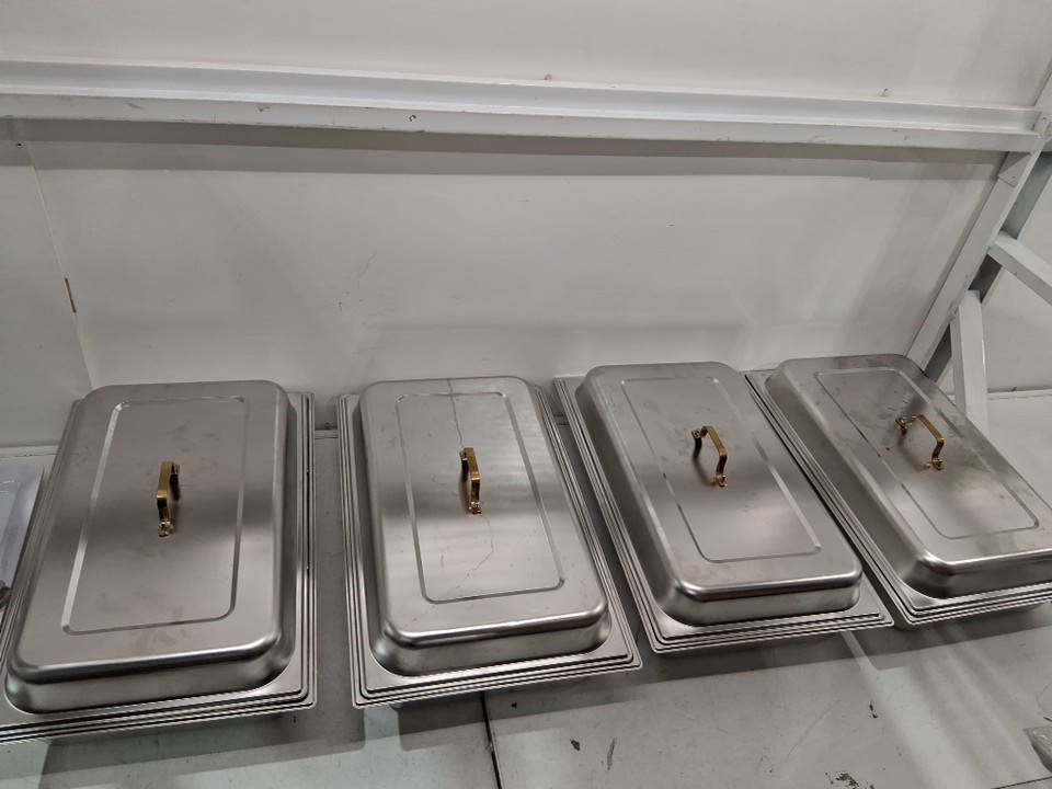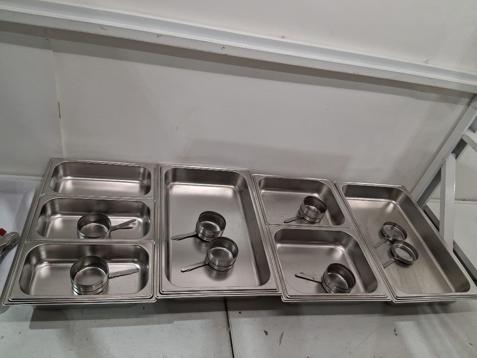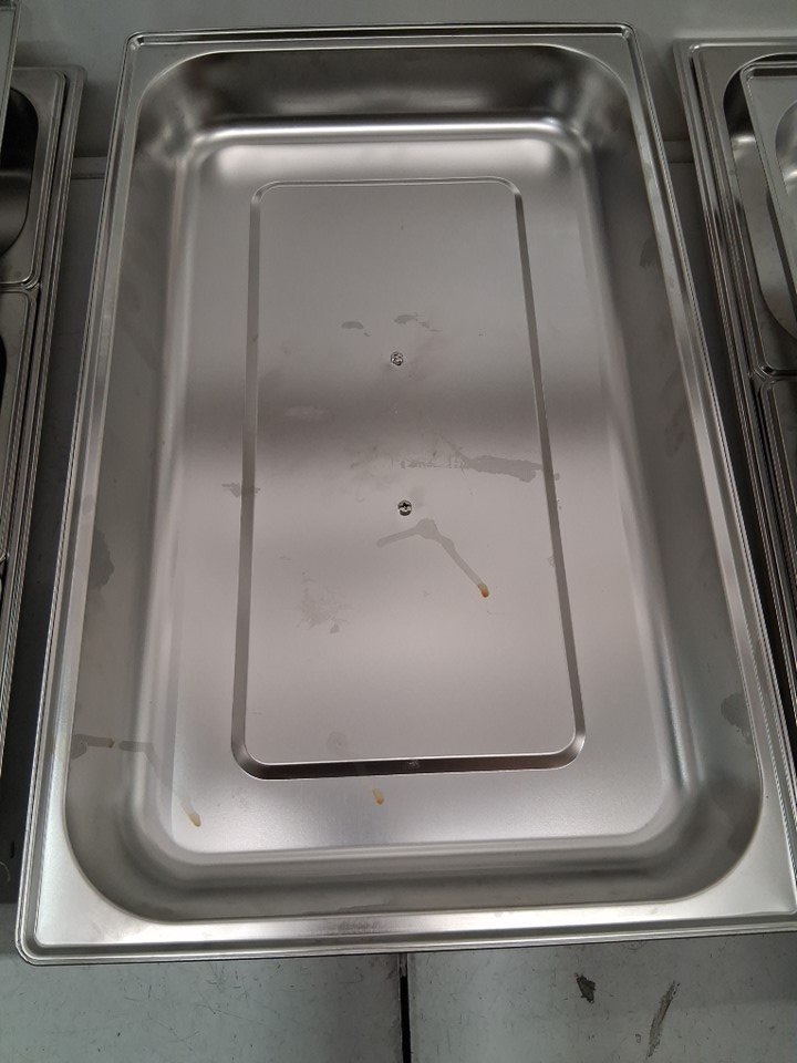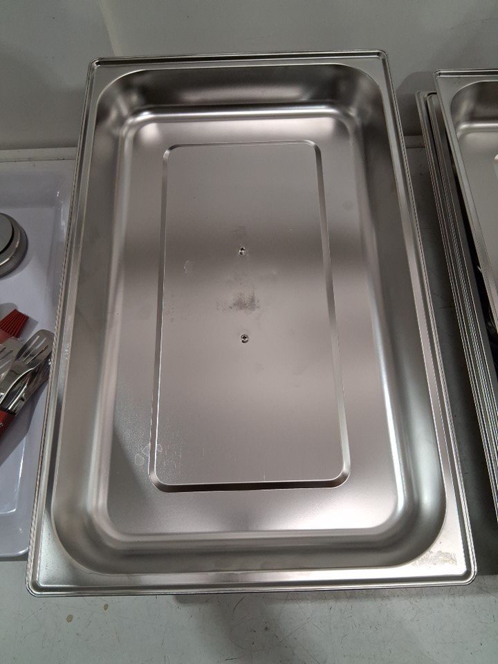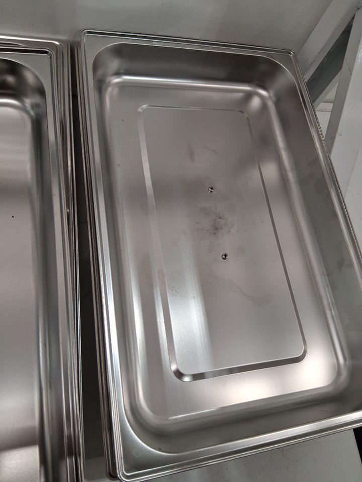 there is some food residue in and around the pans and lids as well as some scuffs and scratches inside and out. there is heating marks on the bottom of one of the pans from previous use the supporting frames and trays are missing, as well as 2 of the fuel cups and 2 pairs of serving tongs