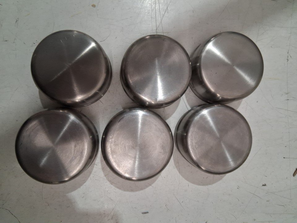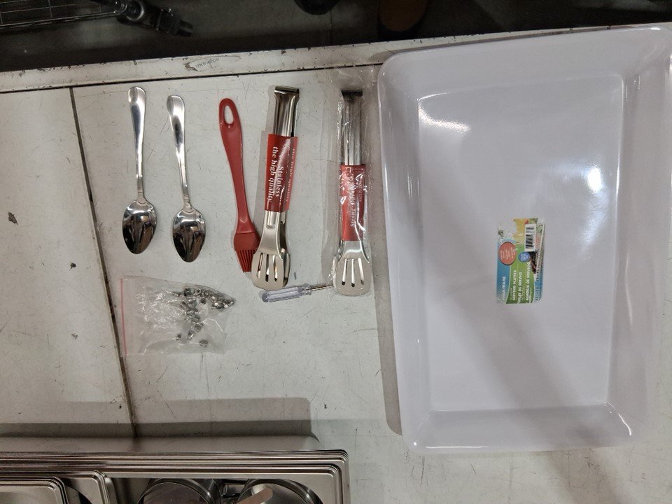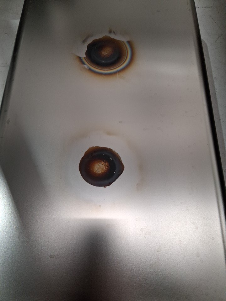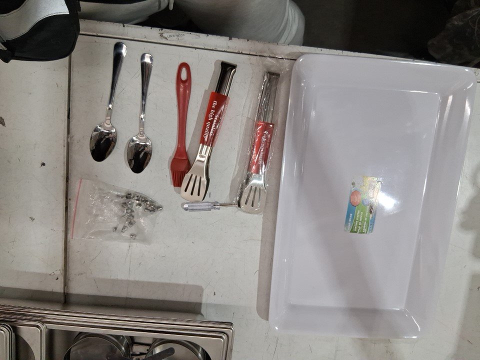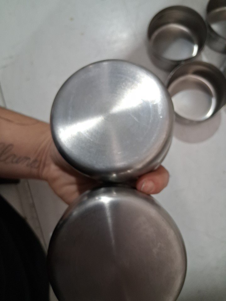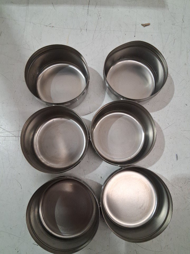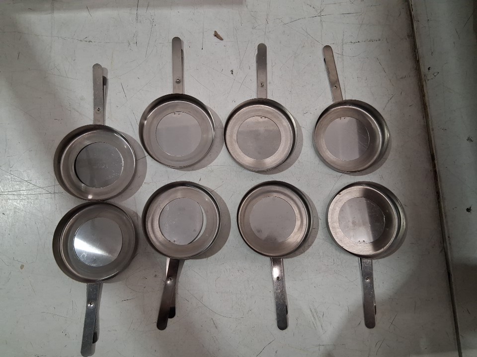 there is some food residue in and around the pans and lids as well as some scuffs and scratches inside and out. there is heating marks on the bottom of one of the pans from previous use the supporting frames and trays are missing, as well as 2 of the fuel cups and 2 pairs of serving tongs