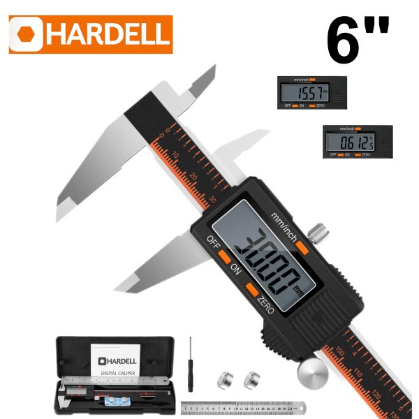 HARDELL Digital Caliper - Stainless Steel Measuring Tool with Large LCD Screen, Electronic Micrometer, Inch/Millimeter Conversion, Auto-Off Feature (Includes Ruler & 2 Batteries) - 6"