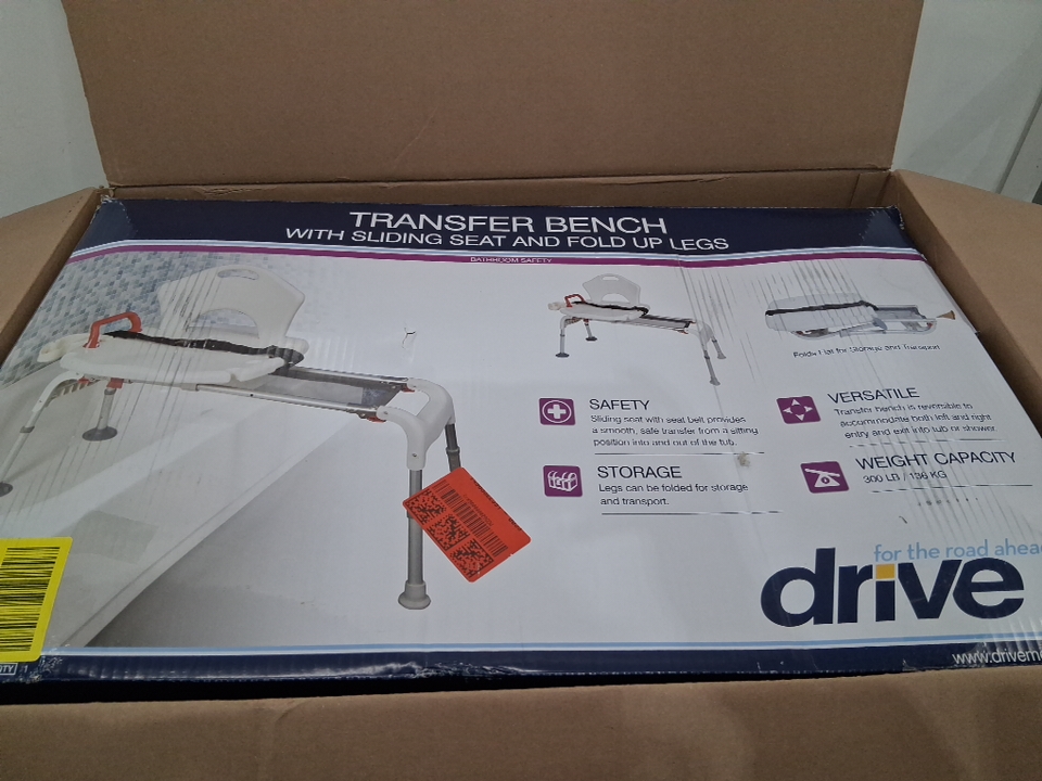 DRIVE UNIVERSAL BATHTUB TRANSFER BENCH FOR ELDERLY WITH SLIDING SEAT AND FOLD UP LEGS - HOLDS UP TO 300LBS - WHITE - (MODEL: RTL12075)