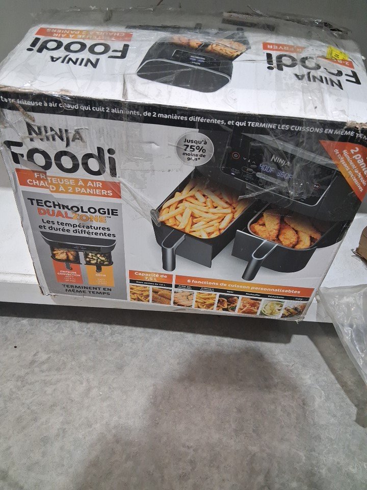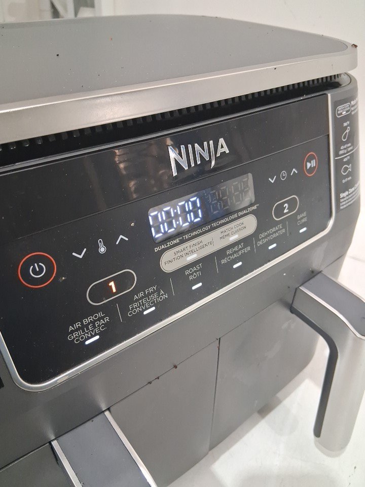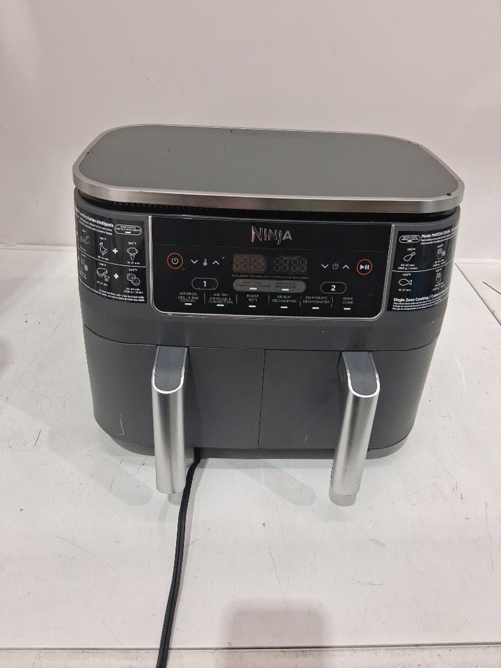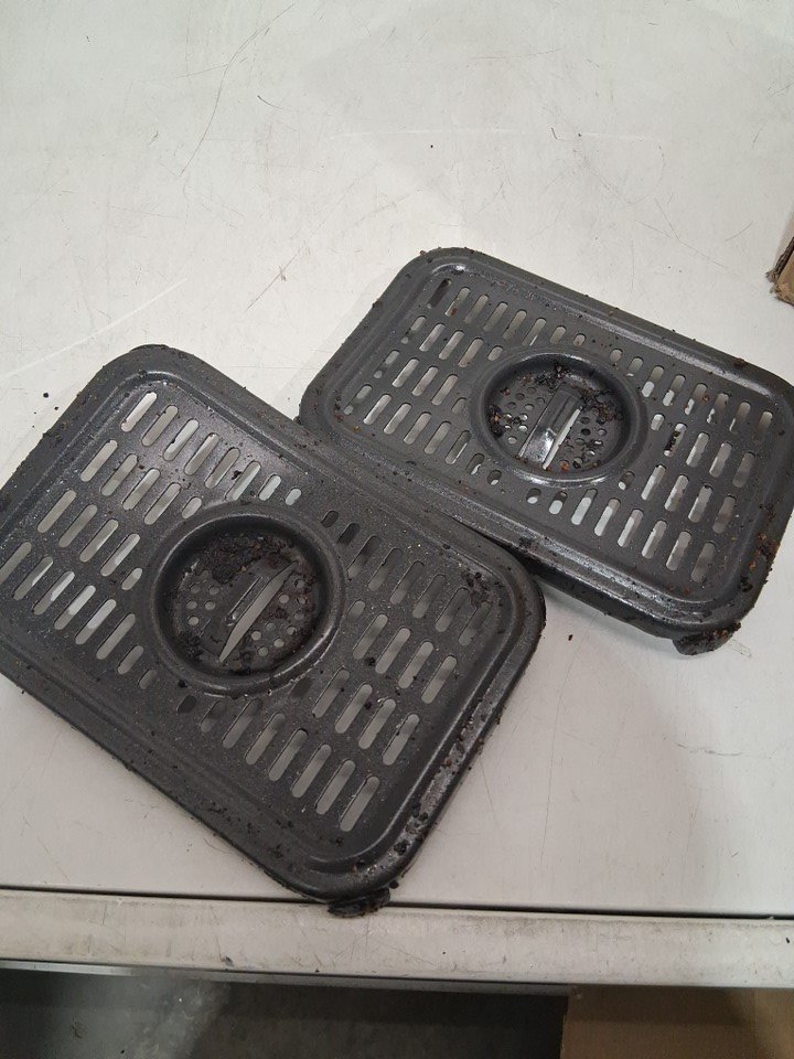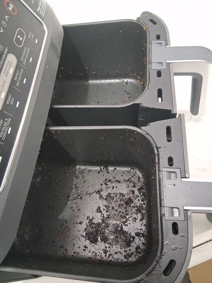 the fryer has a lot of burnt on cooking debris and grease inside the pull out trays as well as some reside on the entirety of the outer item. tested for power.one grate is slightly bent.