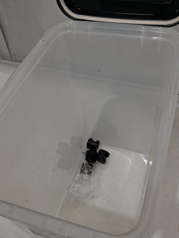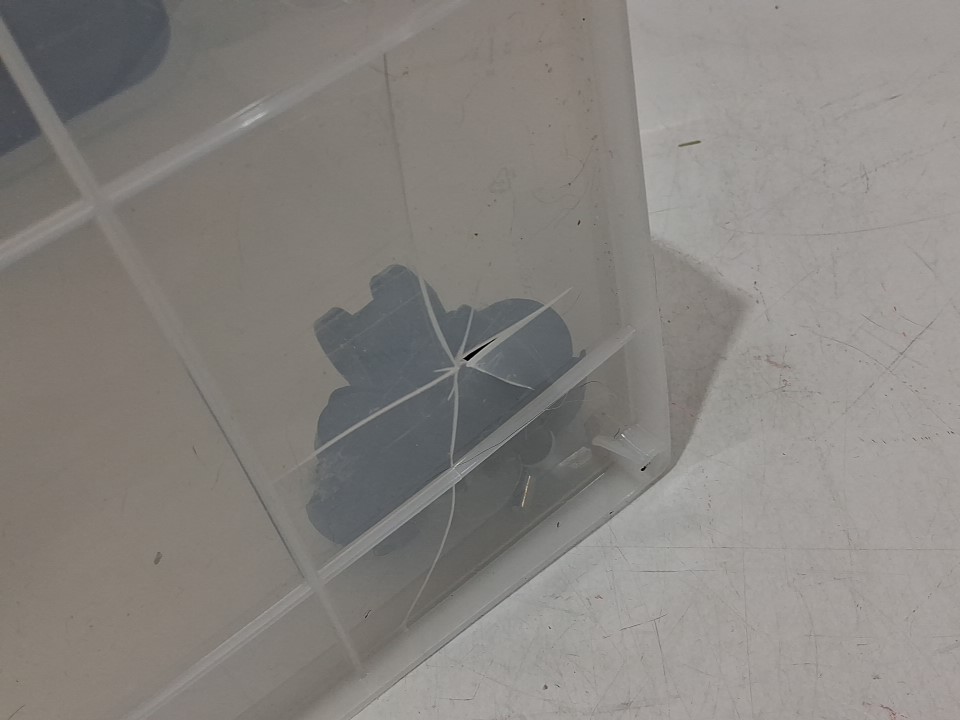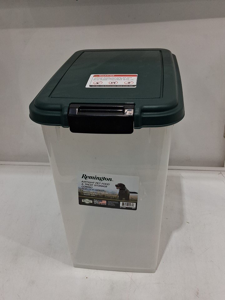 Item has minor pet food debris in the container from previous gentle use, see photos. Item does not include the 12qt treat container or a scoop; there is a crack in the bottom of the 33qt container which appears repairable, see photos.