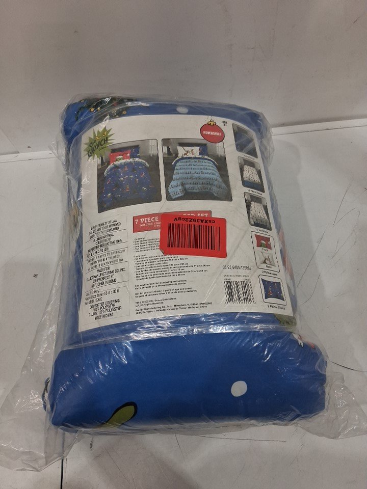 7pc the grinch by dr. seuss bed set - reversable comforter- fitted sheet-flat sheet- 2 pillow shams, 2 pillowcases- size queen - multi colour (model:6c6968)