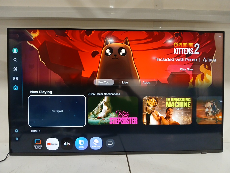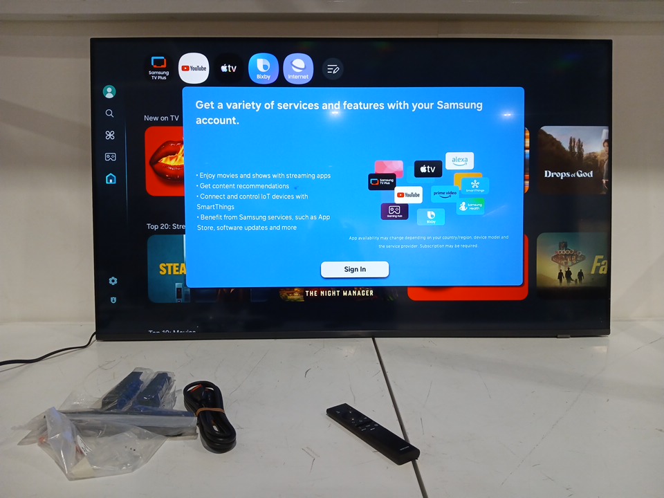 the tv has been tested for power & connectivity, however the samsung add account prevents from testing for pixel damage or going into other apps to check functionality.