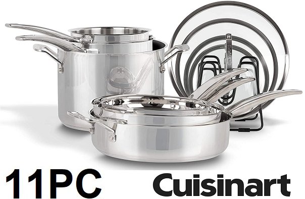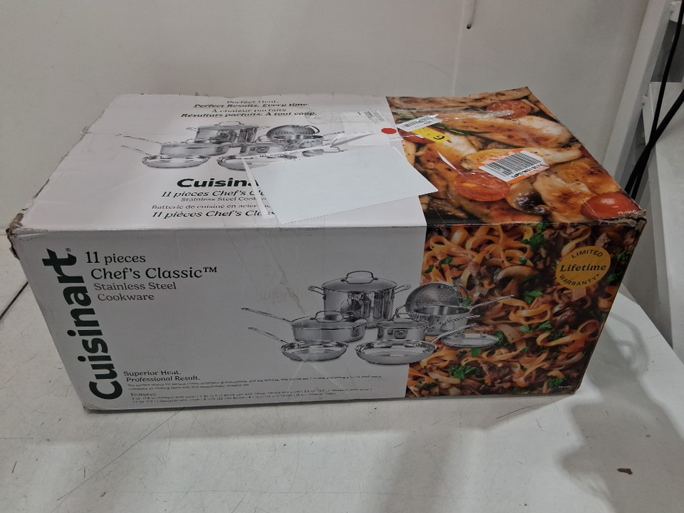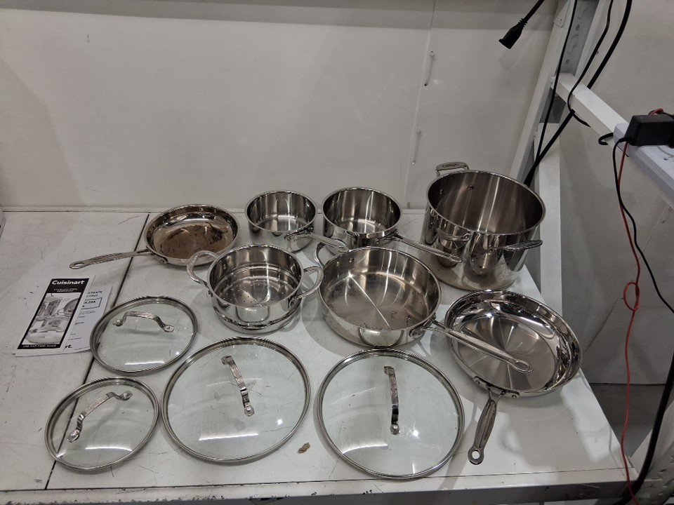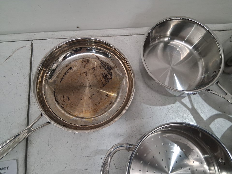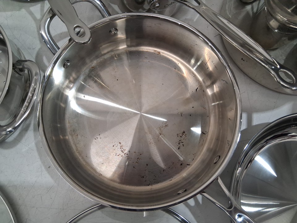 please note that 3 of the 11 pieces have damage to them, it appears that the bottoms of each are scratched and previously used, the remainder of the pans and lids appear to be unused.