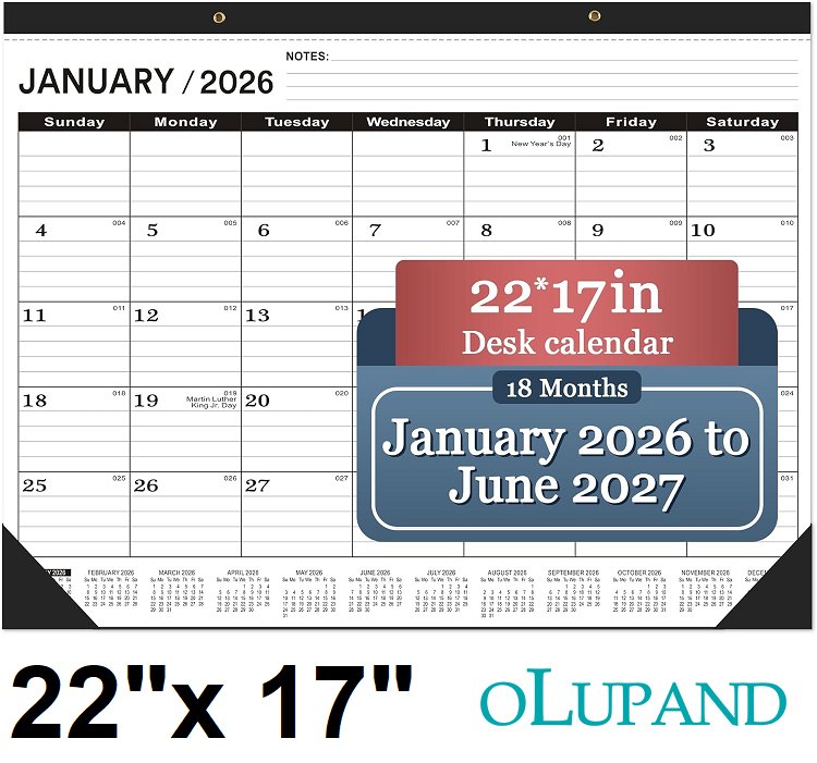olupand Desk Calendar 2026 (January 2026 to June 2027) - 22" x 17" - Black