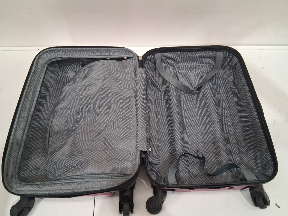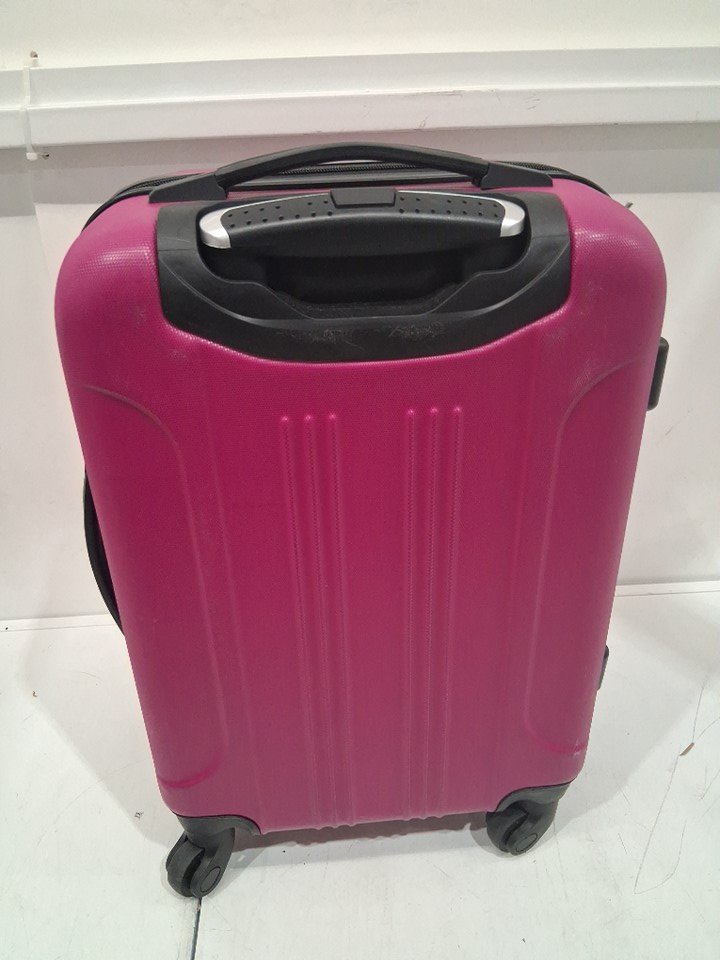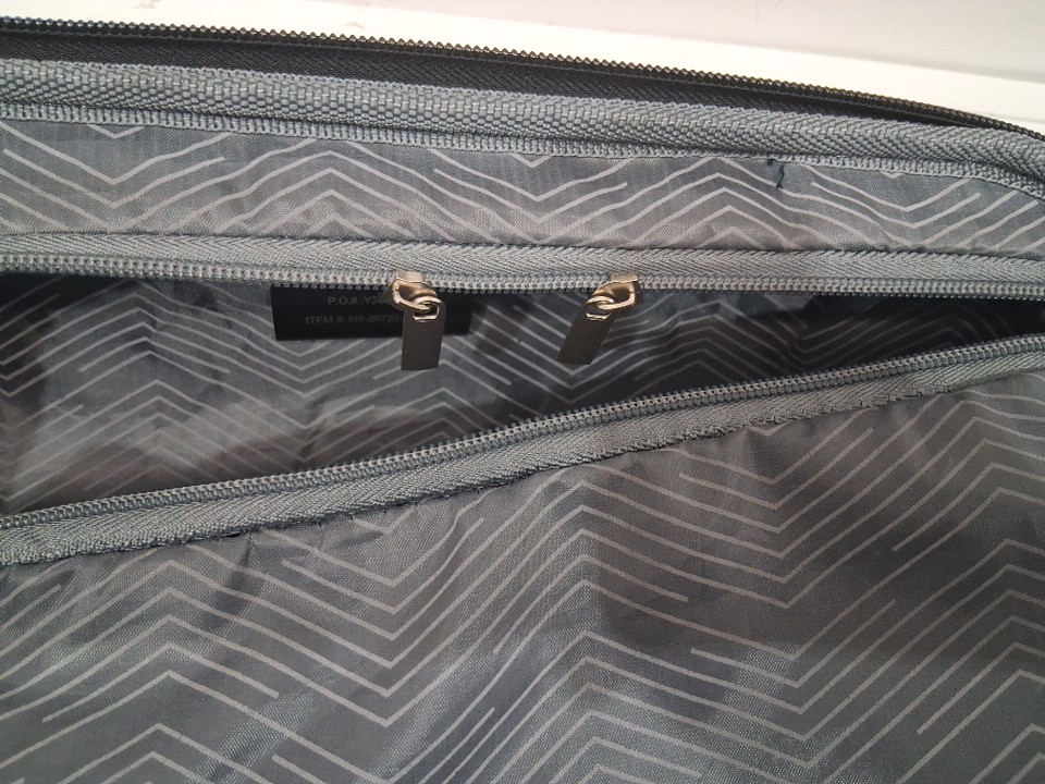 Item shows signs of previous use such as mild scuffs/scratches on corners, wheels, and outside surface of item. Inside pocket does not zip closed as the zipper is no longer connected to the track, could be repaired.