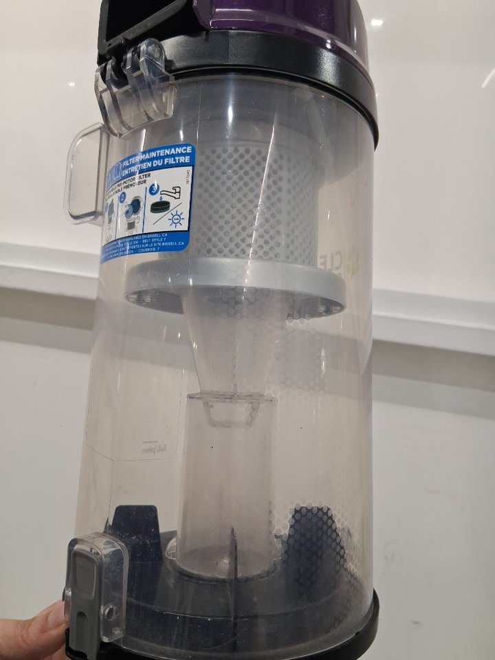 Dirt/dust from previous use in filter and under vacuum, filter closing clip broken off, will not fully clip when closed. Item was tested for power
