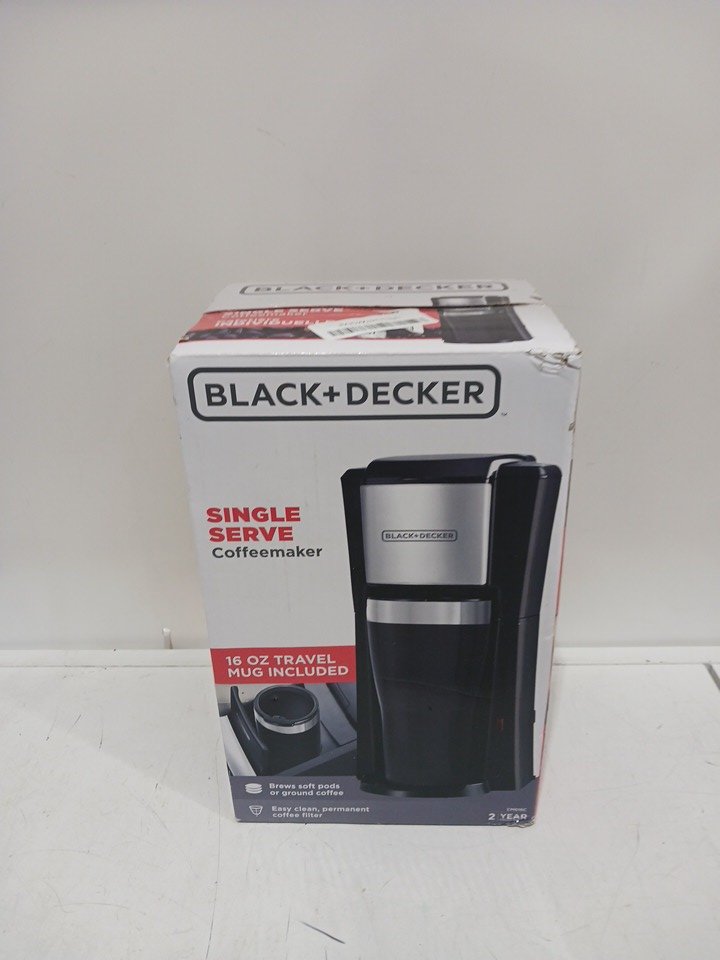 BLACK AND DECKER SINGLE SERVE COFFEE MAKER with 16oz travel mug- TRAVEL MUG HEIGHT - BLACK - (MODEL: CM618)