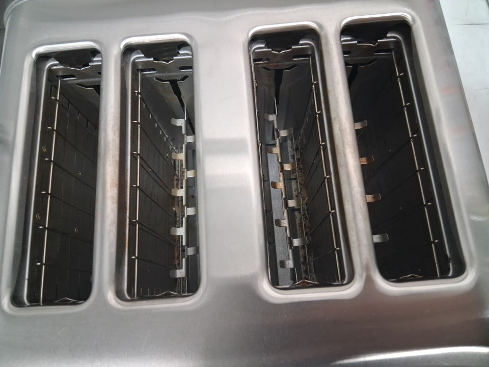 the item has some crumbs and burn marks inside the slots, finger print marks on the outer item. tested for power.
