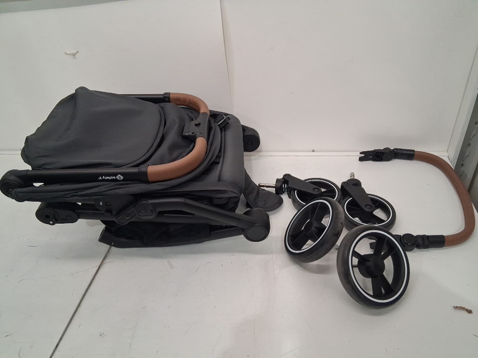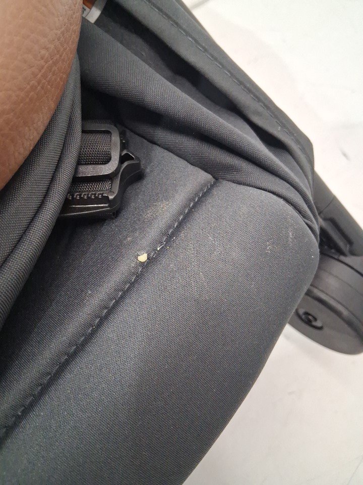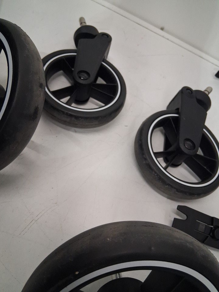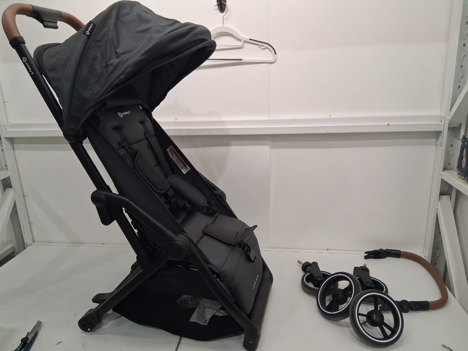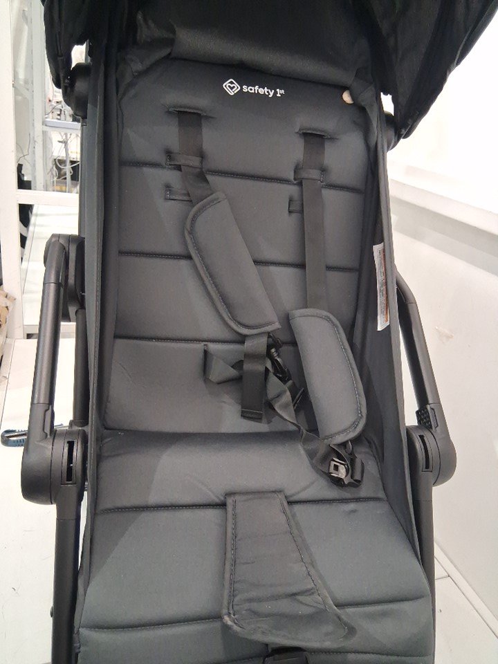 Wheels have visible dirt discoloration, where back wheels attach there is visible dirt stains. Seat has light food stains