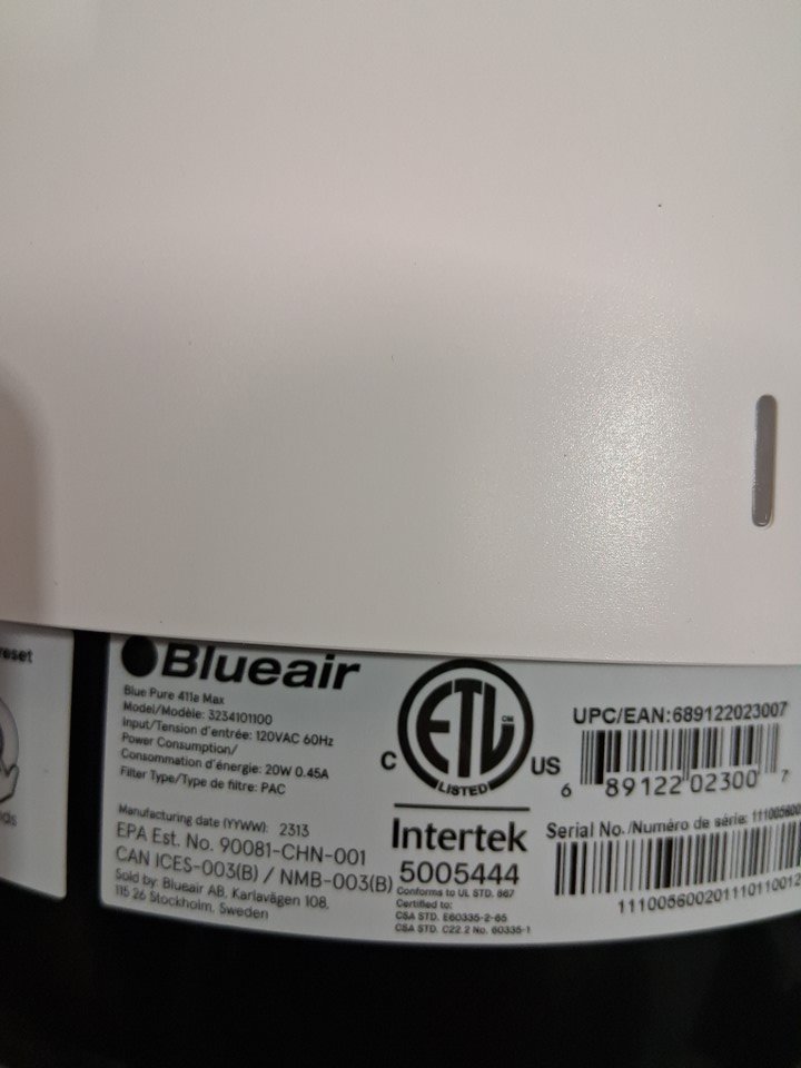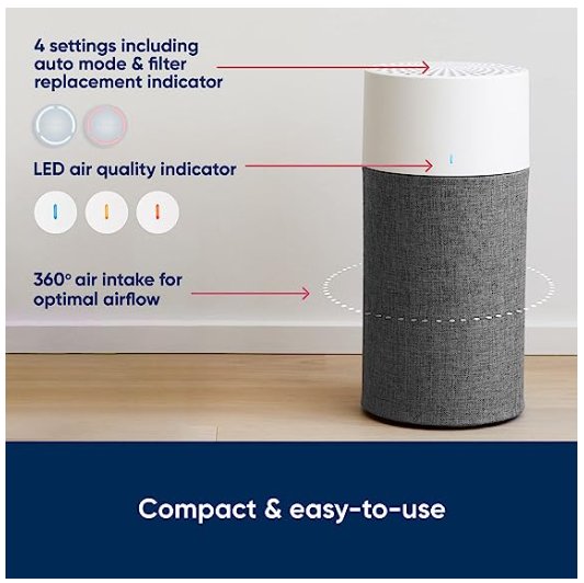 BLUEAIR BLUE PURE 411A HEPAFILTER AIR PURIFIER WITH PRE-FILTER SLEEVE - CLEANS 1050SQ.FT/HOUR - WHITE/GREY (MODEL: 3234101100