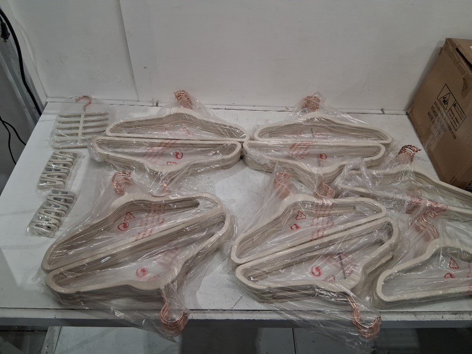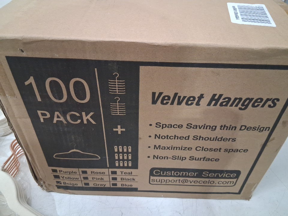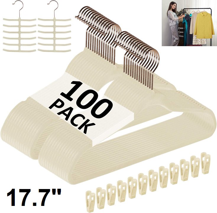 100pk vecelo Premium Velvet Clothes Hangers with 12 Finger Clips & 2 Tie Racks - 17.7" x 9" - beige (model: khd-pc-vh-beige-a100)