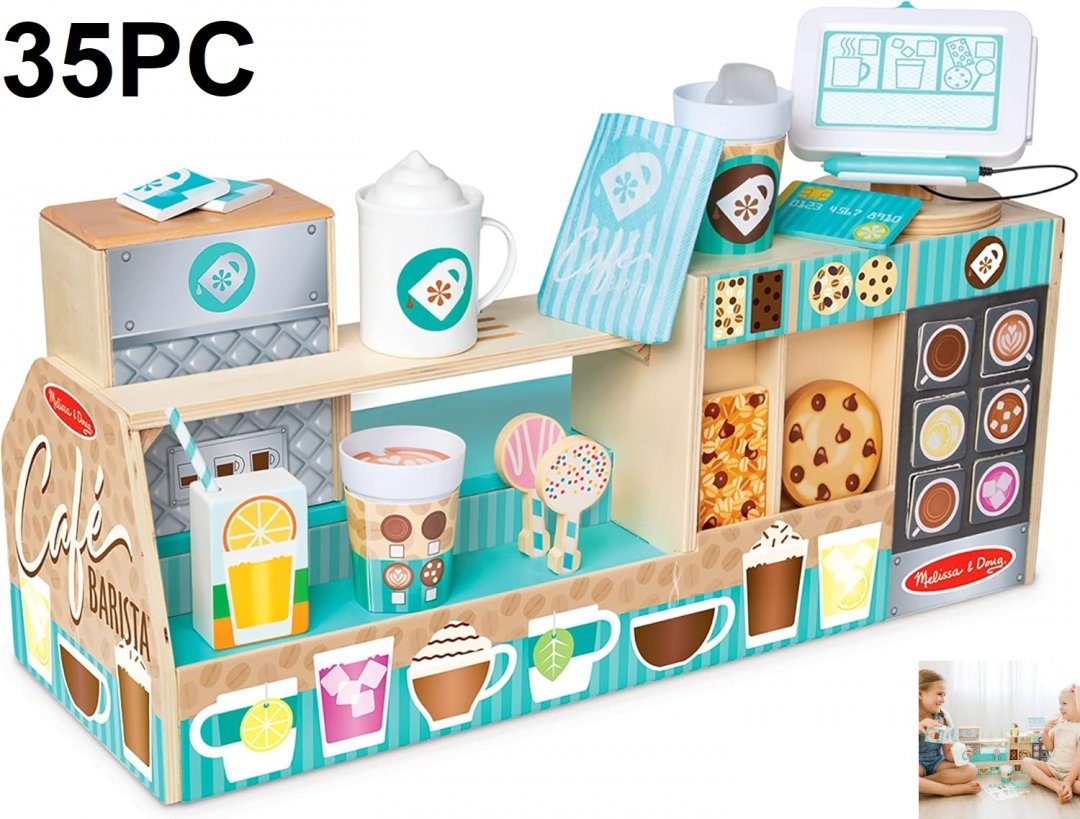 35PC MELISSA & DOUG WOODEN COFFEE SHOP BARISTA CAFE PLAYSET