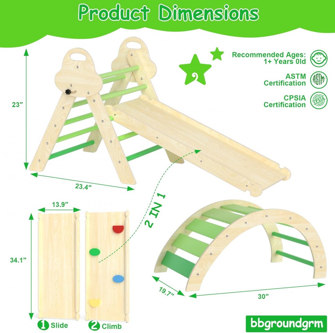 BBGROUNDGRM 7-IN-1 WOODEN CLIMBING TOY FOR KIDS/TODDLERS - INDOOR PLAYGROUND JUNGLE GYM WITH RAMP/ARCH/LADDER - 140LBS MAX CAPACITY - GREEN