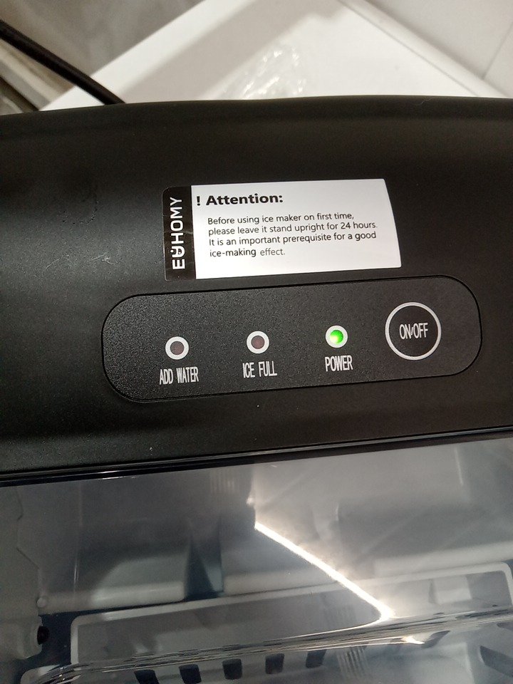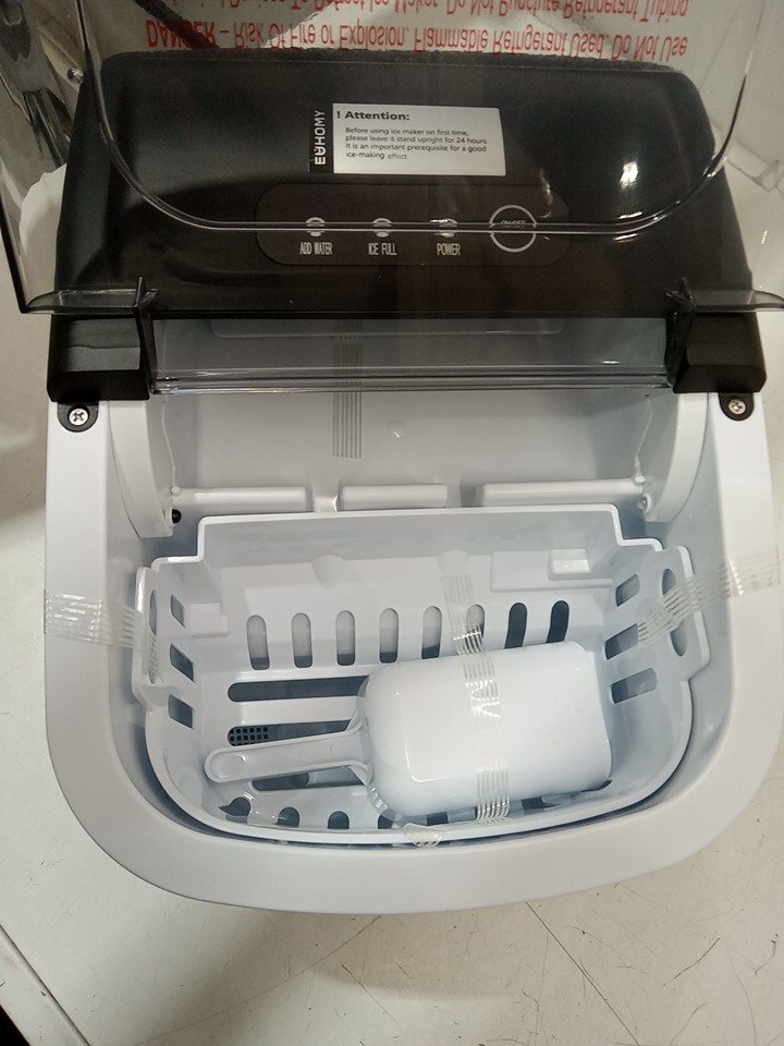 Factory tape inside the ice machine suggesting it is likely new. tested for power only.
