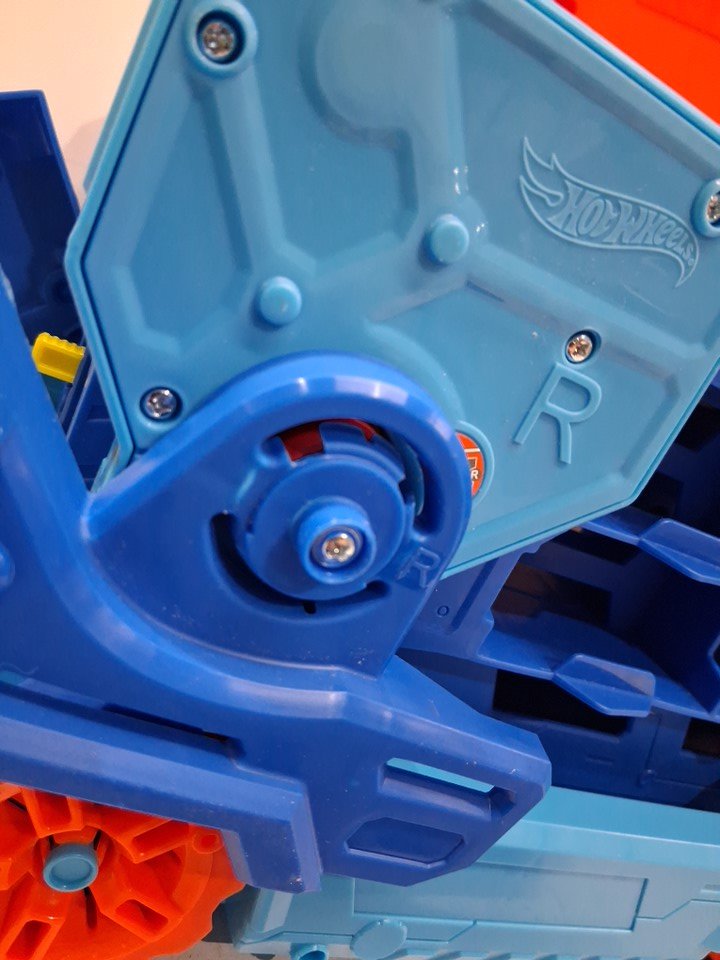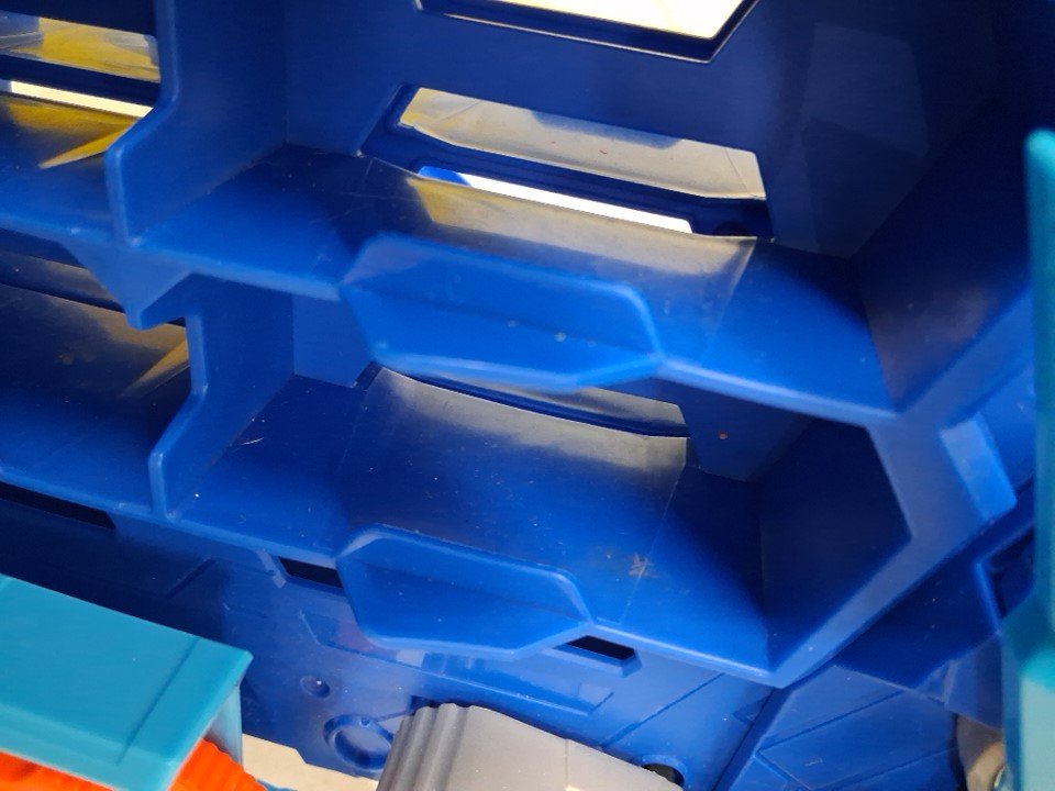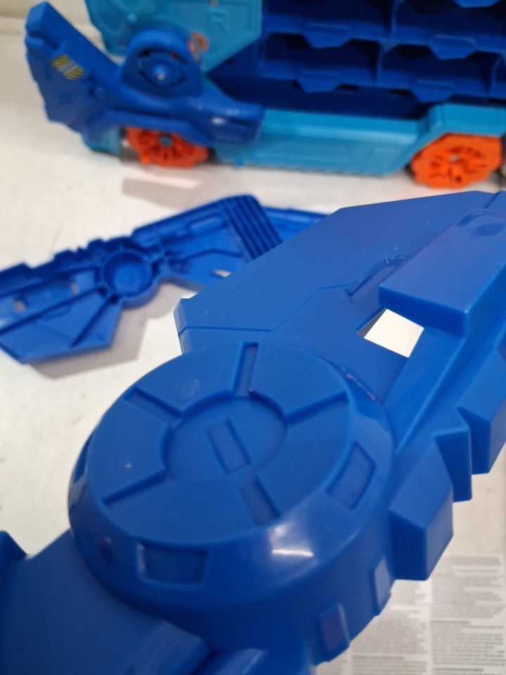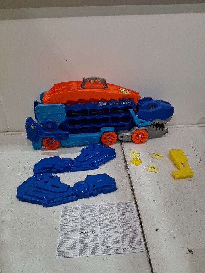item has various minor scratches around body and moving parts from previous light use item is supposed to come with 2 toy cars, they are not in box.