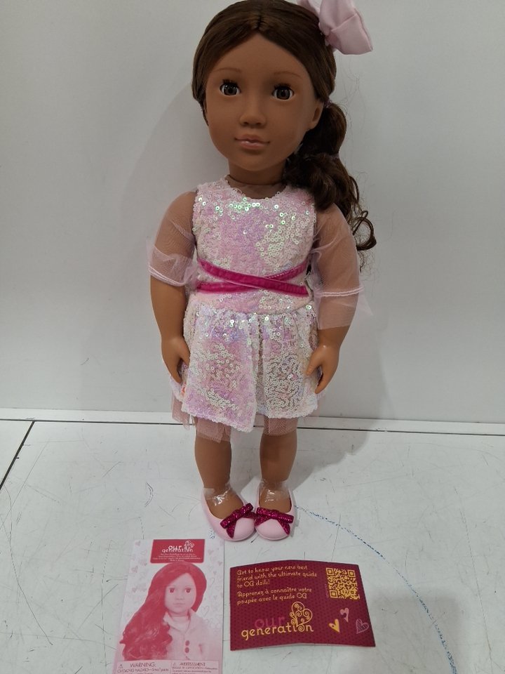 our generation katia fashion doll lifelike hazel eyes & wavy brown hair with shimmery dress - 18" - pink/brunette (model: BD31795Z)