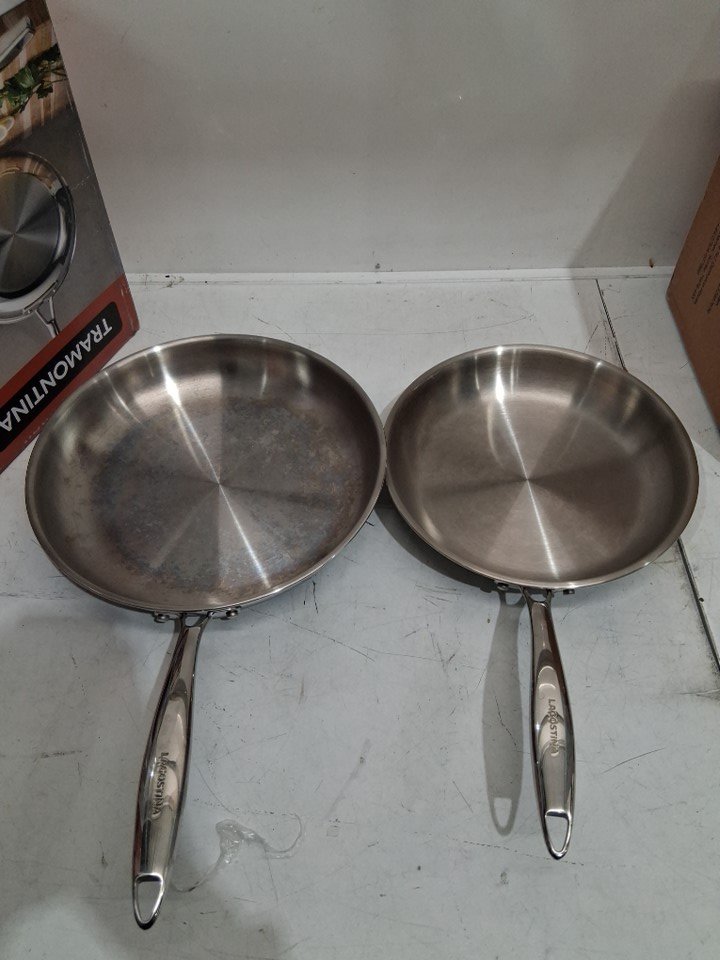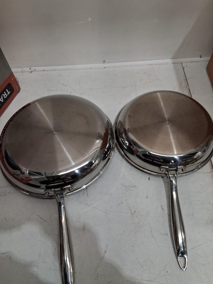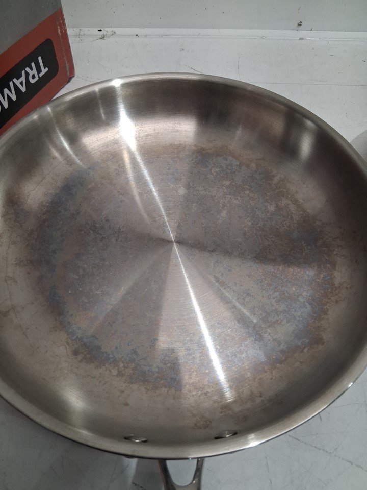 skillet tarnished/stained. MISSING ONE SKLLET AS PACKAGING STATES 3PC but ONLY 2PC