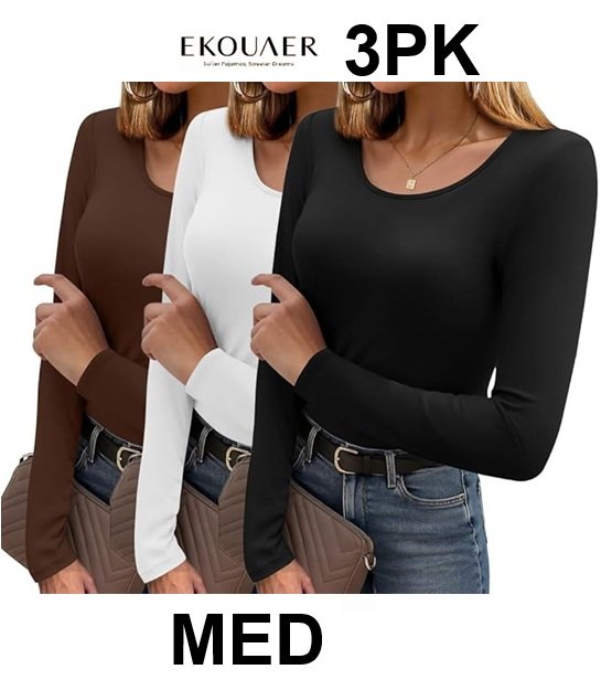 WOMEN'S ekouaer Scoop Neck Long Sleeve Fitted Tops- medium - Black/White/Brown