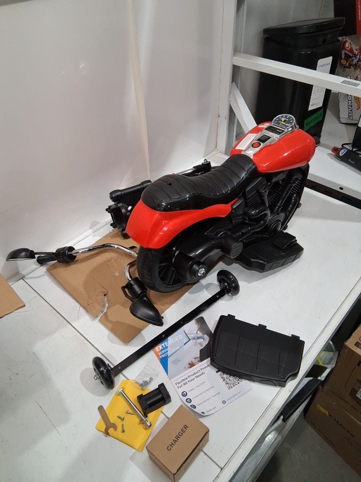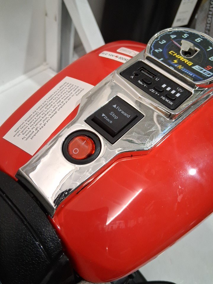 Cosmetic and function issue. AC Adapter shows power, but main bike does not show signs of holding a charge. Still could be a fun ride on toy with or without power. Small scuffs on top of bike. Wheels show no signs of use.
