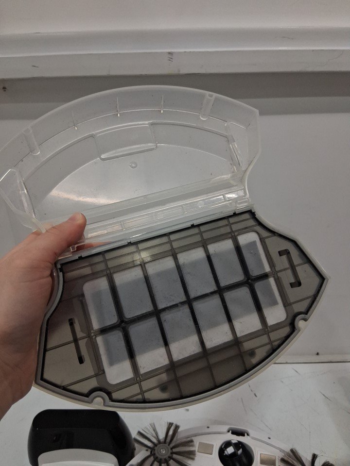 Tested for power, and return to home function. Item has dust/dirt inside of one of the filters and in the roller brush indicating light use.