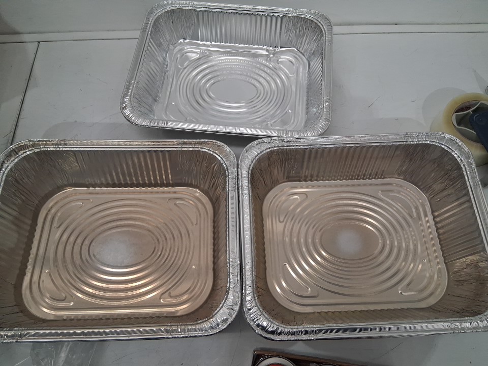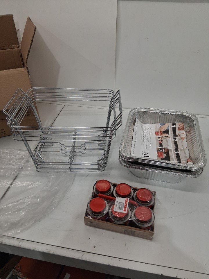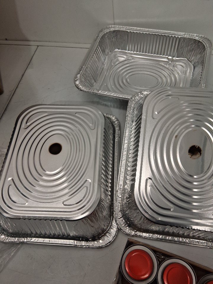 3 chaffing dishes are missing, lids and serving utensils are missing. 4 out of 7 chaffing dishes have light discoloration from water use, and bottoms have carbon spots. fuel cans have been weighed and are still full